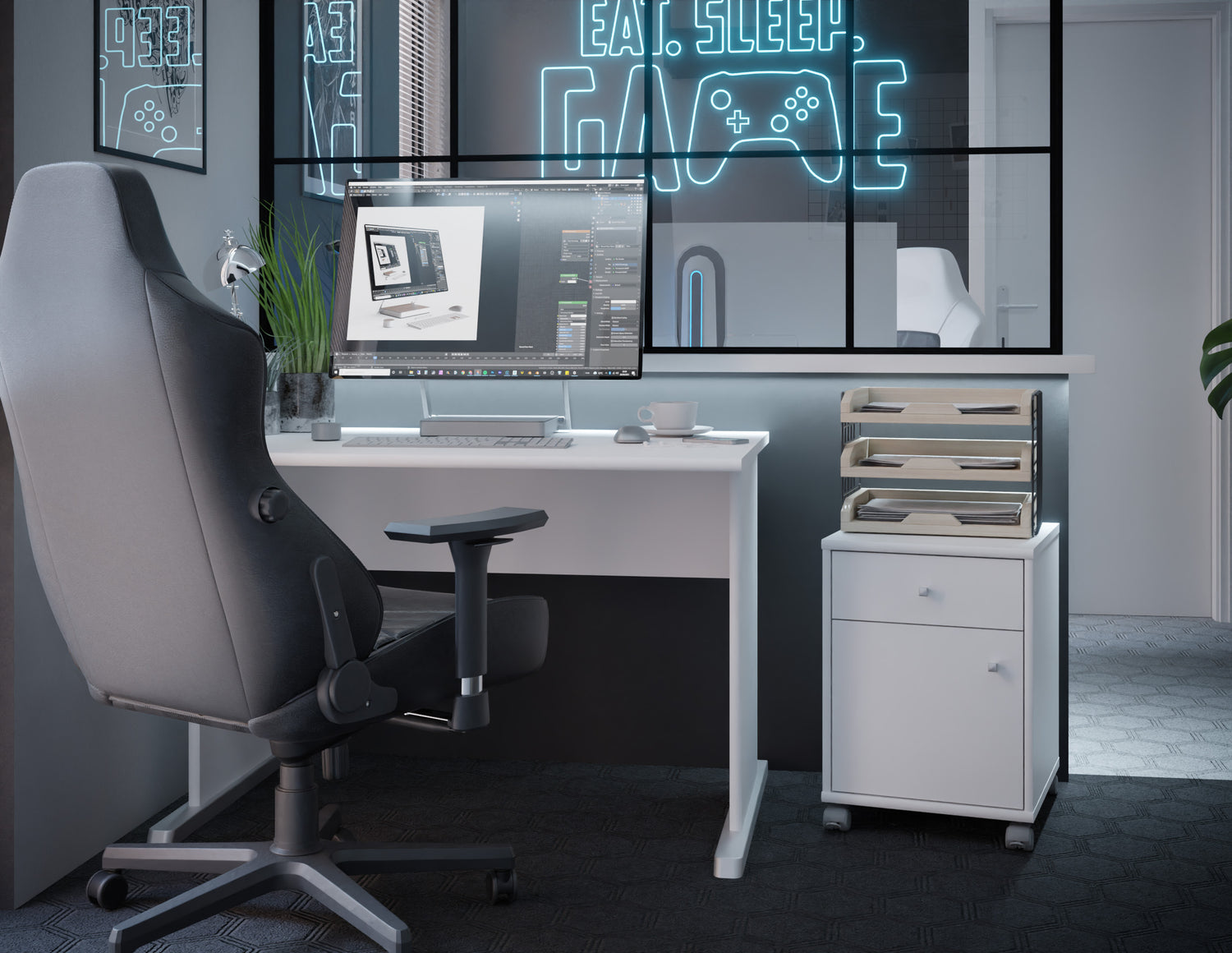 Żeby zacząć grę, potrzebne jest oczywiście odpowiednie stanowisko! My proponujemy niezawodne biurko TENMA23, jako serce całego pokoju oraz miejsce na komputer i monitor. Do tego fotel gamingowy DRAKE, żeby zadbać o poprawną posturę – w grze i w pracy – i kilka personalnych itemów w kontenerku pod biurko TENMA20.