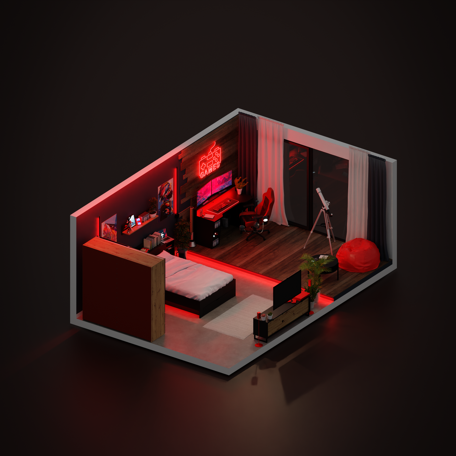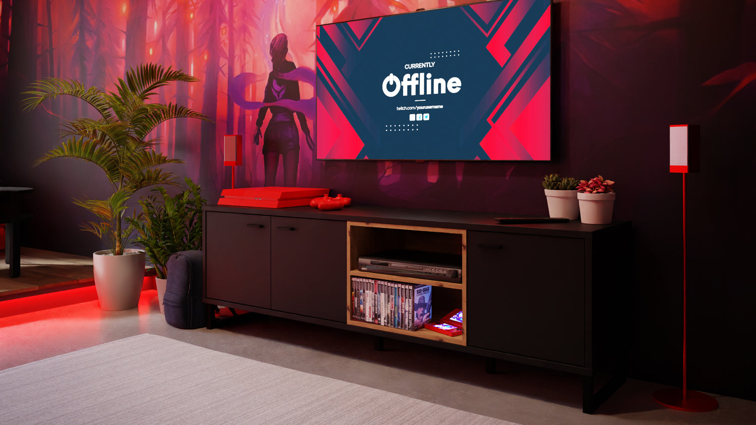 Przygotowaliśmy też kącik dla prawdziwego konsolowca, konesera kina czy wielbiciela wieczornych streamów! Tu również kierowaliśmy się tym, aby utrzymać tą samą kolorystykę składającą się z czerwieni, czerni i minimalistycznych elementów w dekorze drewna. Aby udało nam się to utrzymać w tym samym tonie w strefie konsolowej została wykorzystana czarna szafka RTV z wnęką w kolorze dębu. Zakamuflowała się tu perfekcyjnie, niczym kameleon.