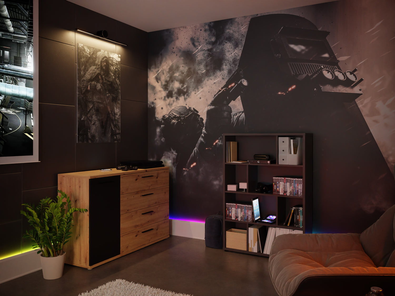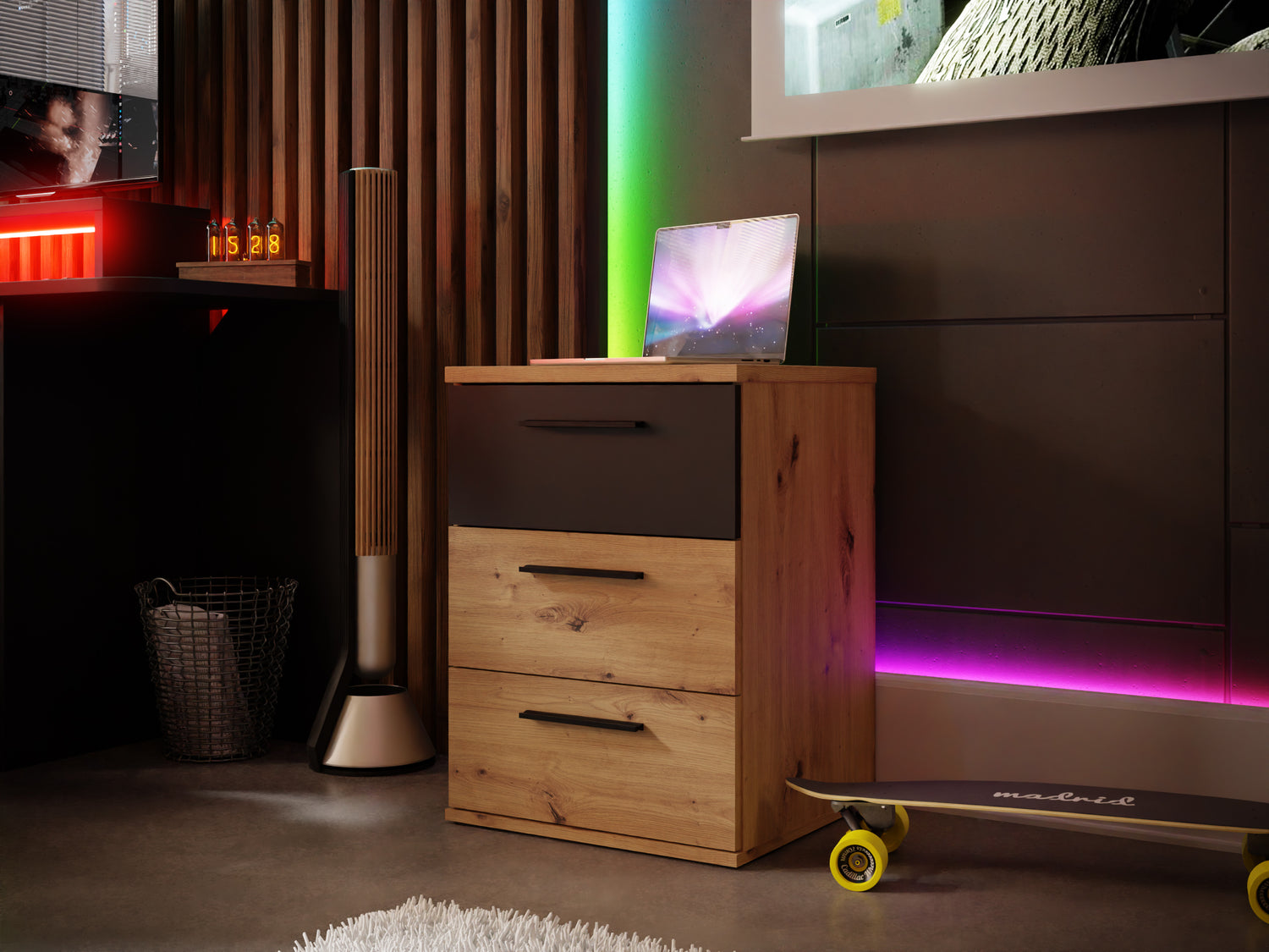 jakimi dysponujesz jest piorunująca. Trzeba je gdzieś pochować prawda? Domowe biuro zostało wyposażone w regał LYNX311- szary. Bez większego problemu pomieści wszystkie segregatory, skoroszyty a nawet gry! Oczywiście nie zapominamy o miejscu na Twoje ulubione bluzy czy koszulki, które zakładasz już po pracy. Świetnym miejscem dla nich będzie komoda EARTH225 - kolor dębu z czarnym dekorem.