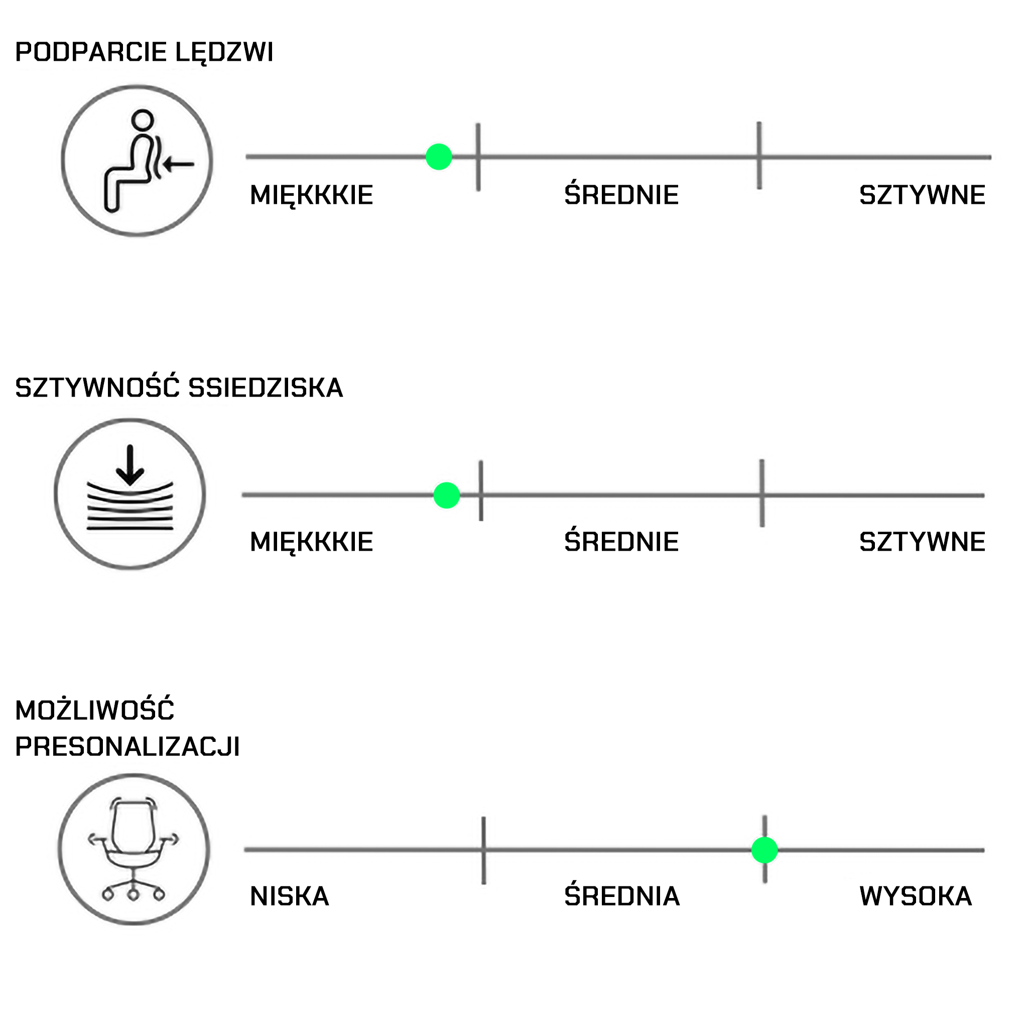 Funkcja ta jest szczególnie przydatna użytkownikom o najwyższych wymaganiach względem komfortu podczas pracy. Umożliwia ona dopasowanie fotela do użytkownika względem budowy i proporcji ciała sprawiając, że SPACEDUST303 staje się miejscem, którego nie będziesz chciał opuszczać.