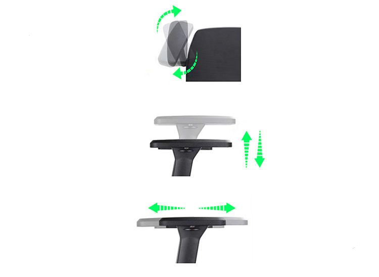 Podłokietniki 3D. Regulacja podłokietnika możliwa jest w trzech płaszczyznach: obrót, wysokość, wysuw przód-tył. Rozwiązanie te pozwala na odpowiednie podparcie rąk zwiększając komfort użytkowania fotela oraz minimalizuje niedogodności takie jak ból nadgarstka podczas długotrwałej pracy z klawiaturą i myszką komputerową.