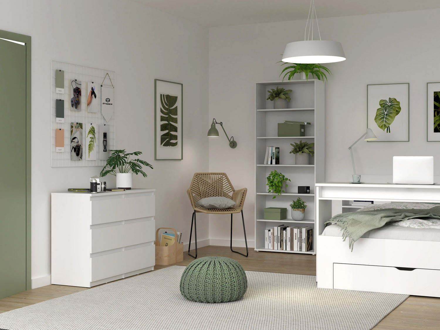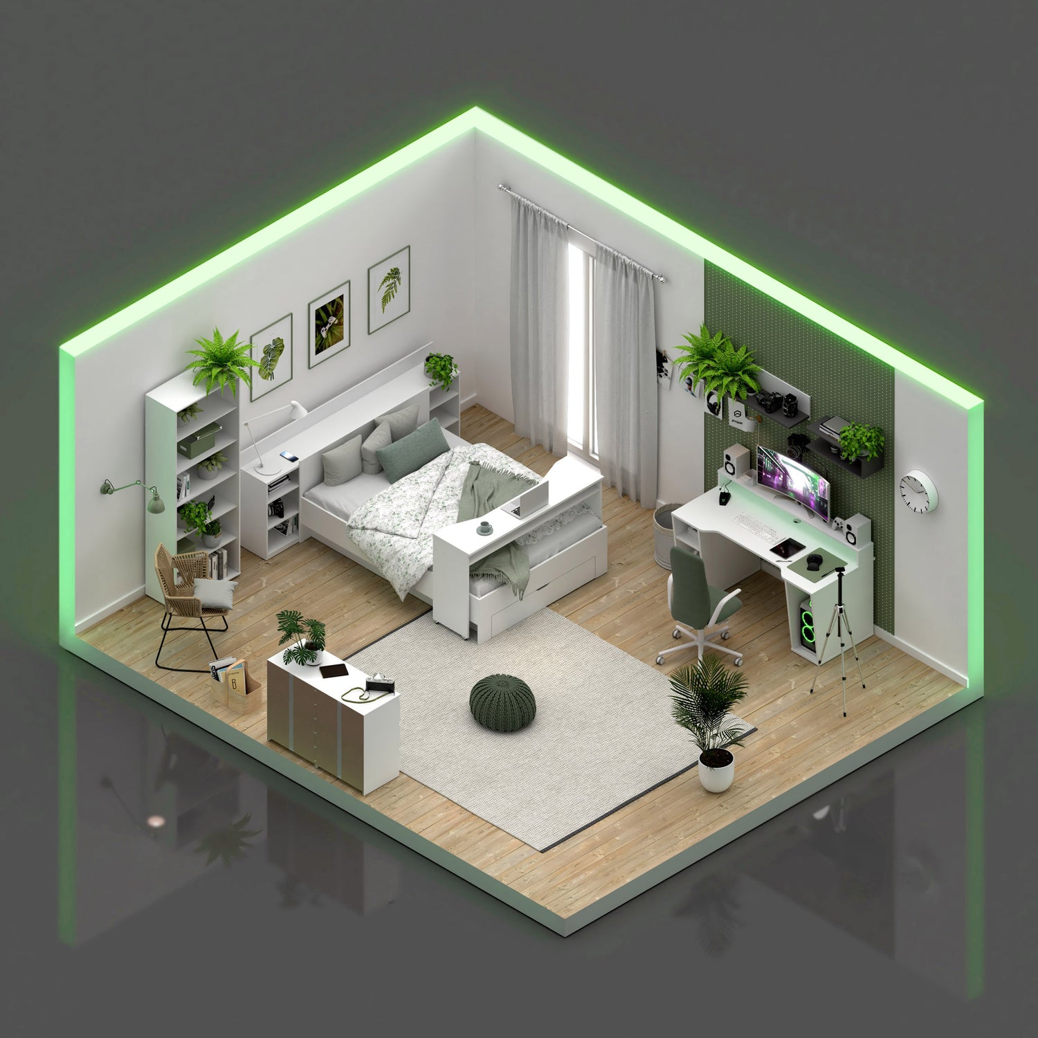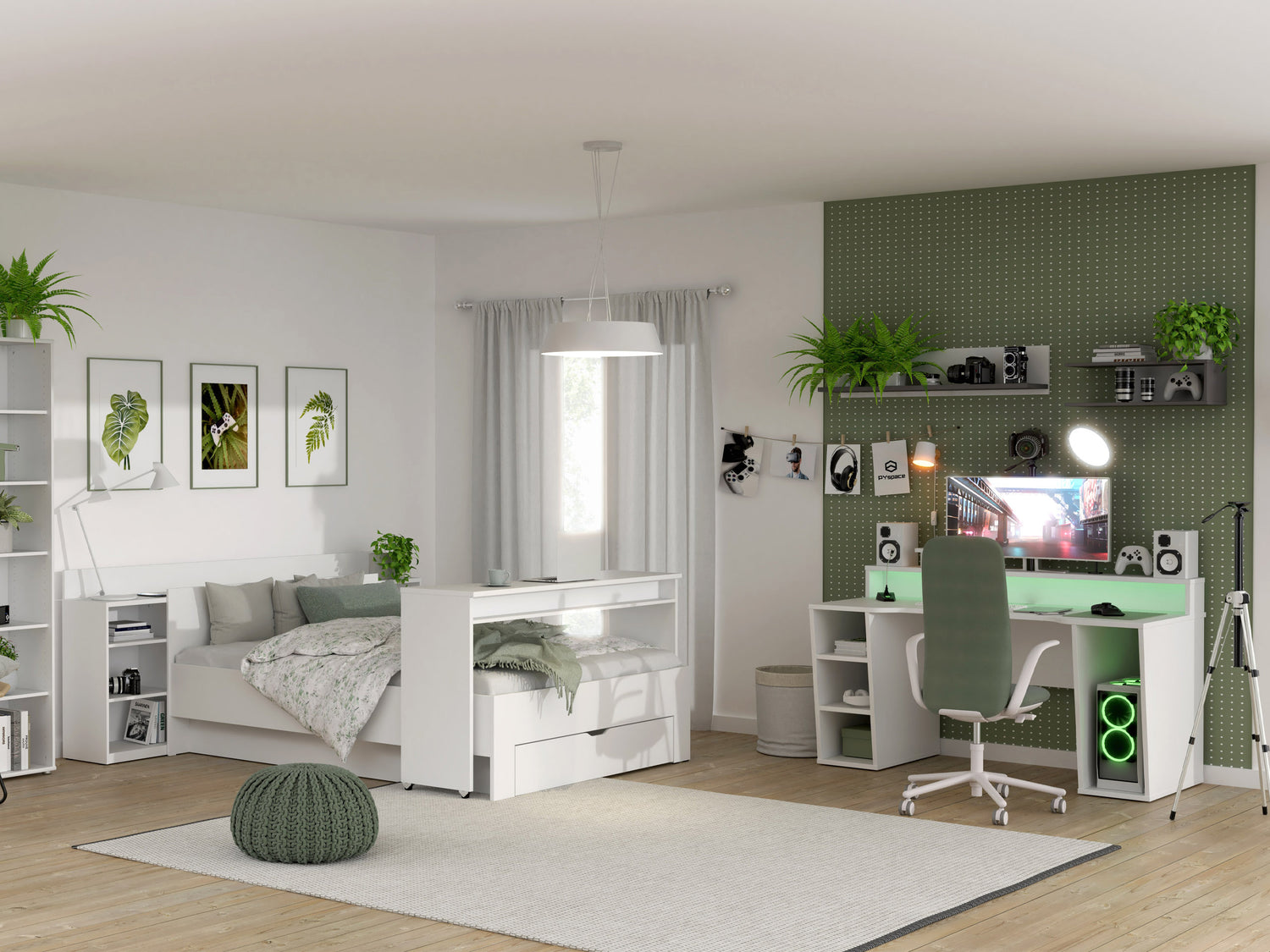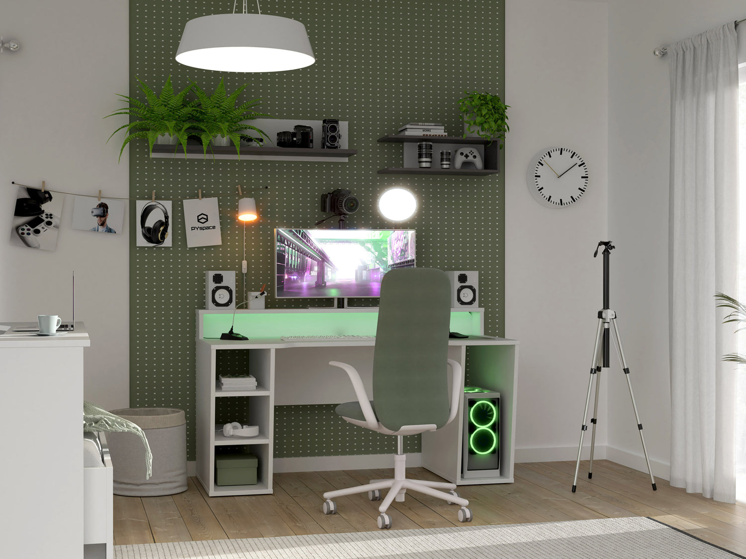 Ten pokój żyje nie tylko roślinami. O, na przykład tutaj, jeśli spojrzysz za nowoczesne biurko gamingowe białe, zobaczysz, że postawiliśmy za nim statyw z kamerą. No, bo kto by nie chciał robić live-streamów przy takim biurku? Trzy wnęki na Twoje skarby, czwarta na PC… Raj na ziemi!