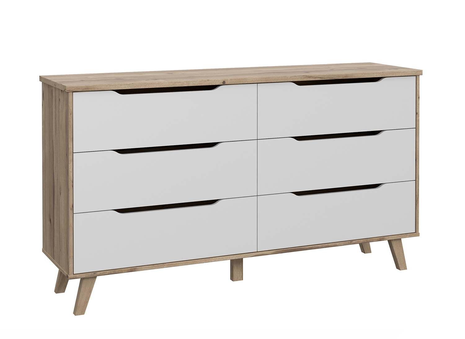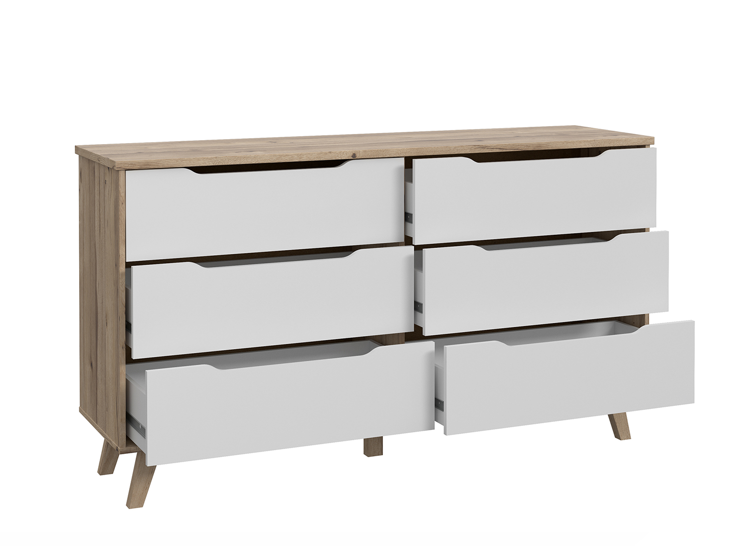 Komoda CEPHEI221 w kolorze dębu i bieli jest wyposażona w sześć pojemnych szuflad, co pozwala na przechowywanie różnorodnych przedmiotów. Wyeksponowane nóżki podkreślają designerski wygląd produktu, a duży blat pozwala na umieszczenie na niej różnych dekoracji czy innych potrzebnych rzeczy. Łatwa do czyszczenia powierzchnia zapewnia utrzymanie komody w nienagannym stanie, co sprawia, że jest to mebel zarówno praktyczny, jak i estetyczny.