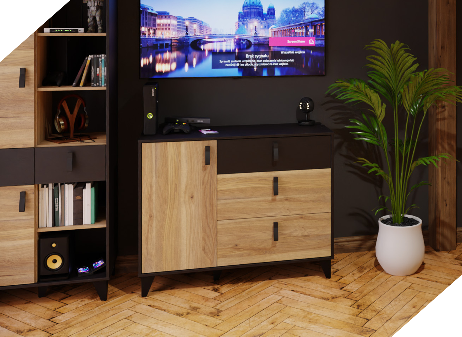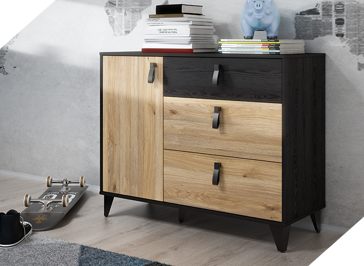 - Nowoczesny design zapewnia idealny wygląd Twojego nowego mebla w każdym pomieszczeniu, ale nie tylko. Dzięki zastosowaniu nowoczesnego designu, komoda w kolorze czerni i drewna dębowego spełnia również walory dekoracyjne