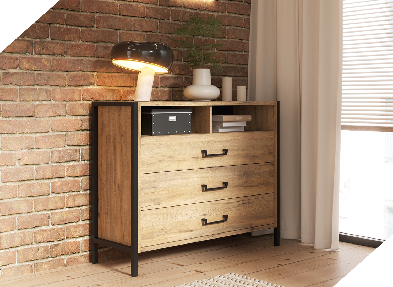 - Metalowe nóżki i uchwyty stylowo kontrastują z kolorem drewna, nadając komodzie nowoczesny wygląd w stylu loftowym, oraz świetnie dopasowują się do innych mebli z kolekcji ZEMYA.