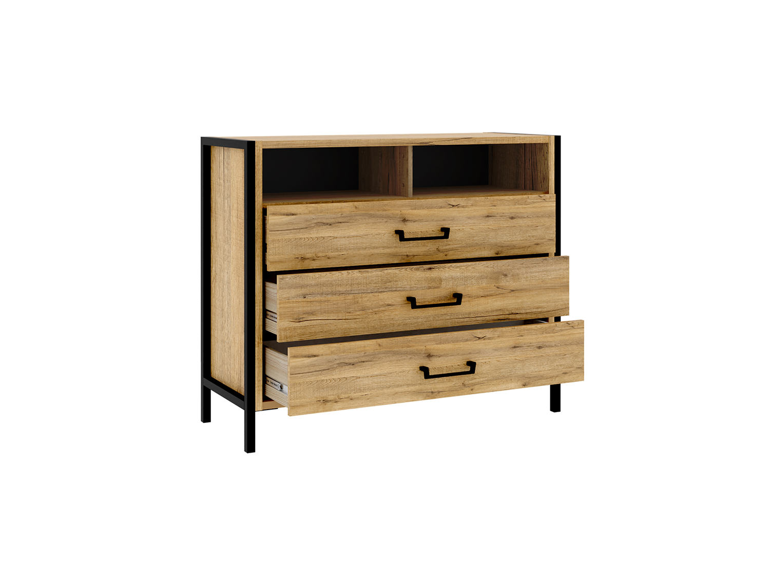 - Dodatkowa przestrzeń do przechowywania i ozdabiania, dzięki trzem szufladom I dwóm otwartym wnękom. Uprość sobie organizowanie przestrzeni i utrzymanie porządku dzięki komodzie w kolorze drewna ZEMYA212.