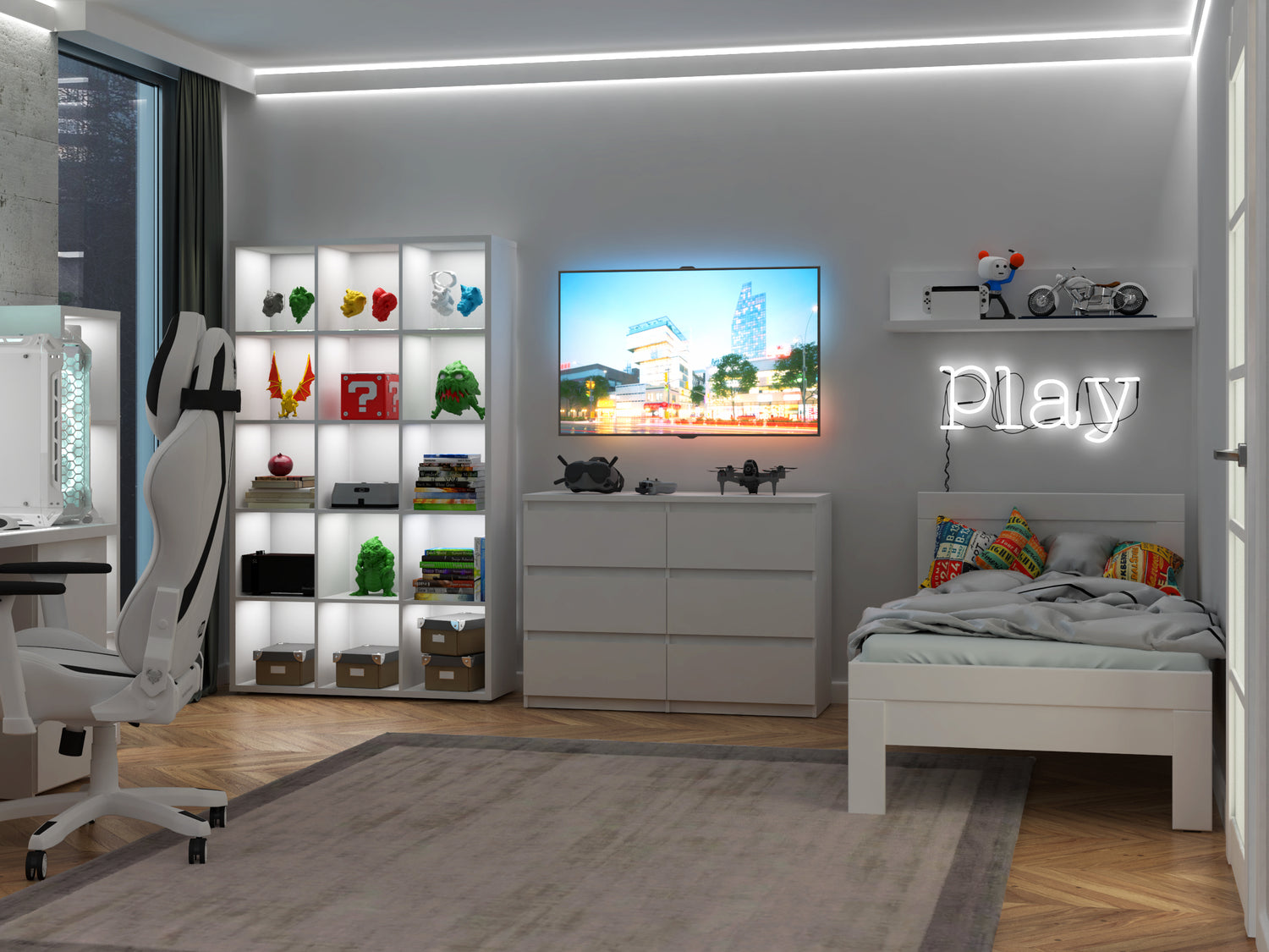 Jak jesteśmy przy odpoczynku, wiadomym jest, że Twoje itemy też muszą mieć swoje miejsce w Twoim nowym pokoju, dlatego miejscem ich odpoczynku będzie komoda biała sześć szuflad oraz duży regał biały – 15 wnęk.