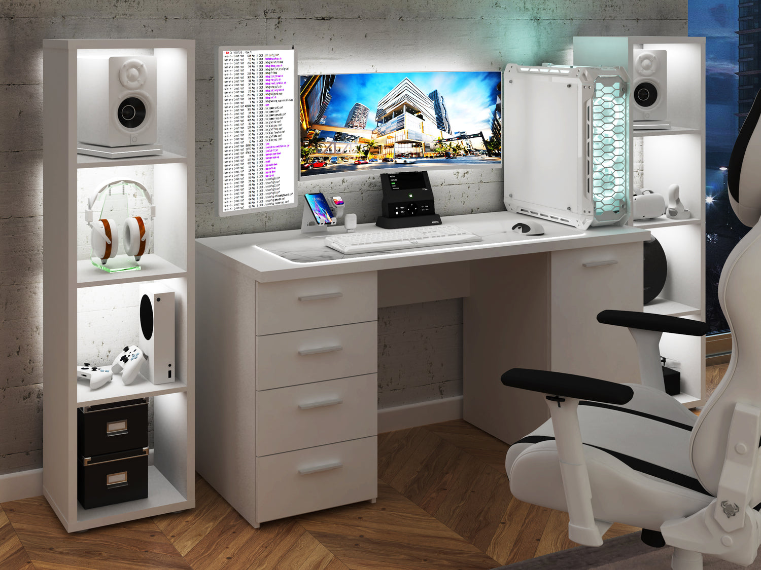 Sercem małego białego pokoju młodzieżowego, jest stanowisko z biurkiem. To tu będziesz spędzać najwięcej czasu. W tym miejscu będziesz poświęcać swój czas na naukę, rozrywkę a nawet pracę, więc dołożyliśmy wszelkich starań, żeby wyglądała świetnie. Strefę z biurkiem wyposażyliśmy w biurko gamingowe białe z szufladami oraz fotel gamingowy Diablo X-HORN 2.0 biało-czarny. Śmiało możemy nazwać ten zestaw duetem idealnym.