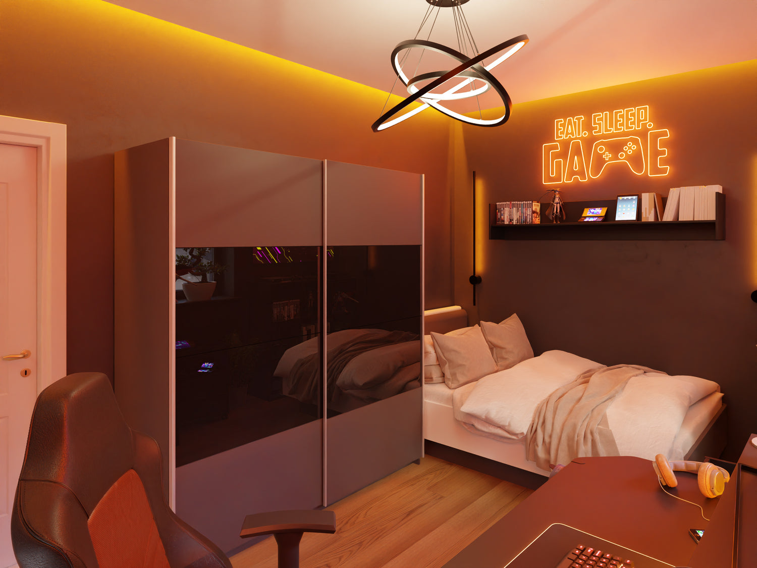 Jak widzisz wystarczy dobrze rozplanować ustawienie Twoich nowych mebli i zklasycznego, niewielkiego pomieszczenia, spokojnie uda Ci się stworzyć wymarzony pokój gamingowy! Niczego się nie obawiaj! Po prostu zaszalej!