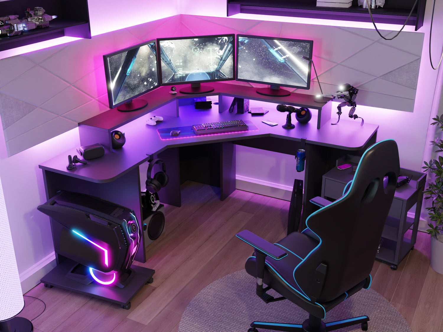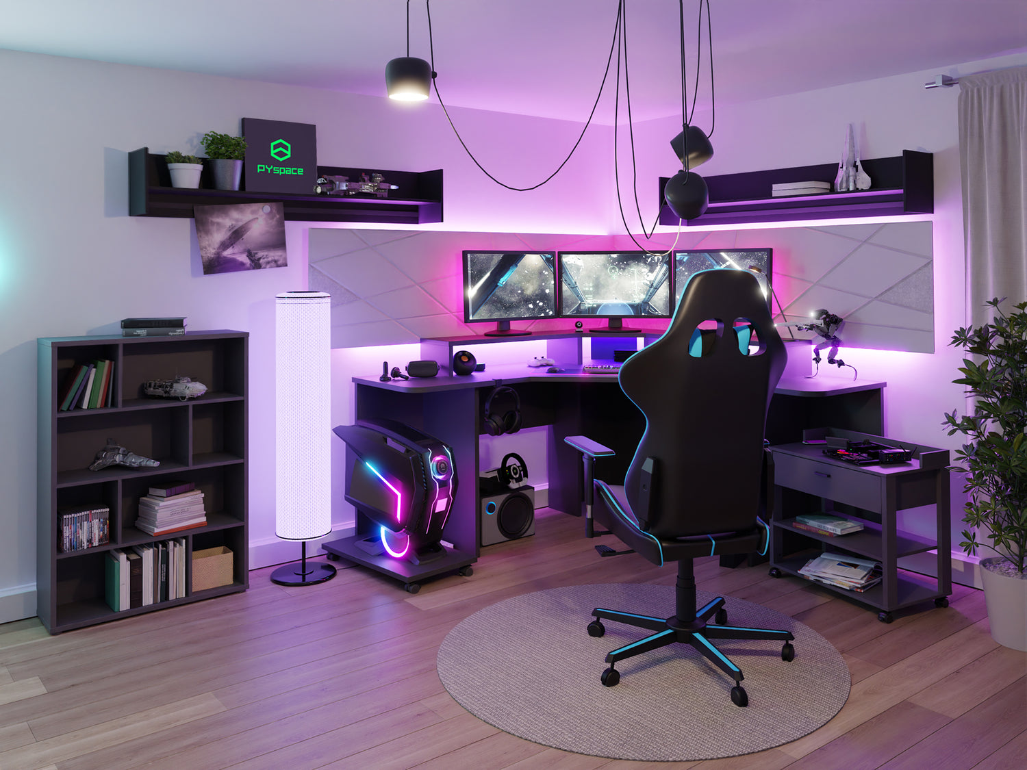 Wiemy jak bardzo potrzebna jest duża ilość blatu, kiedy celujesz w swojego przeciwnika, stąd pojawia się nasza propozycja małego pokoju z biurkiem narożnym! Do przygotowania tego stanowiska komputerowego wykorzystaliśmy oświetlenie LED, które jest niezbędne w każdym pokoju prawdziwego gracza, dodatkowo użyliśmy niezawodgnego biurka marki PYSpace jakim jest narożne biurko gamingowe czarne 160 cm, oraz kontenera na kółkach z szufladą.