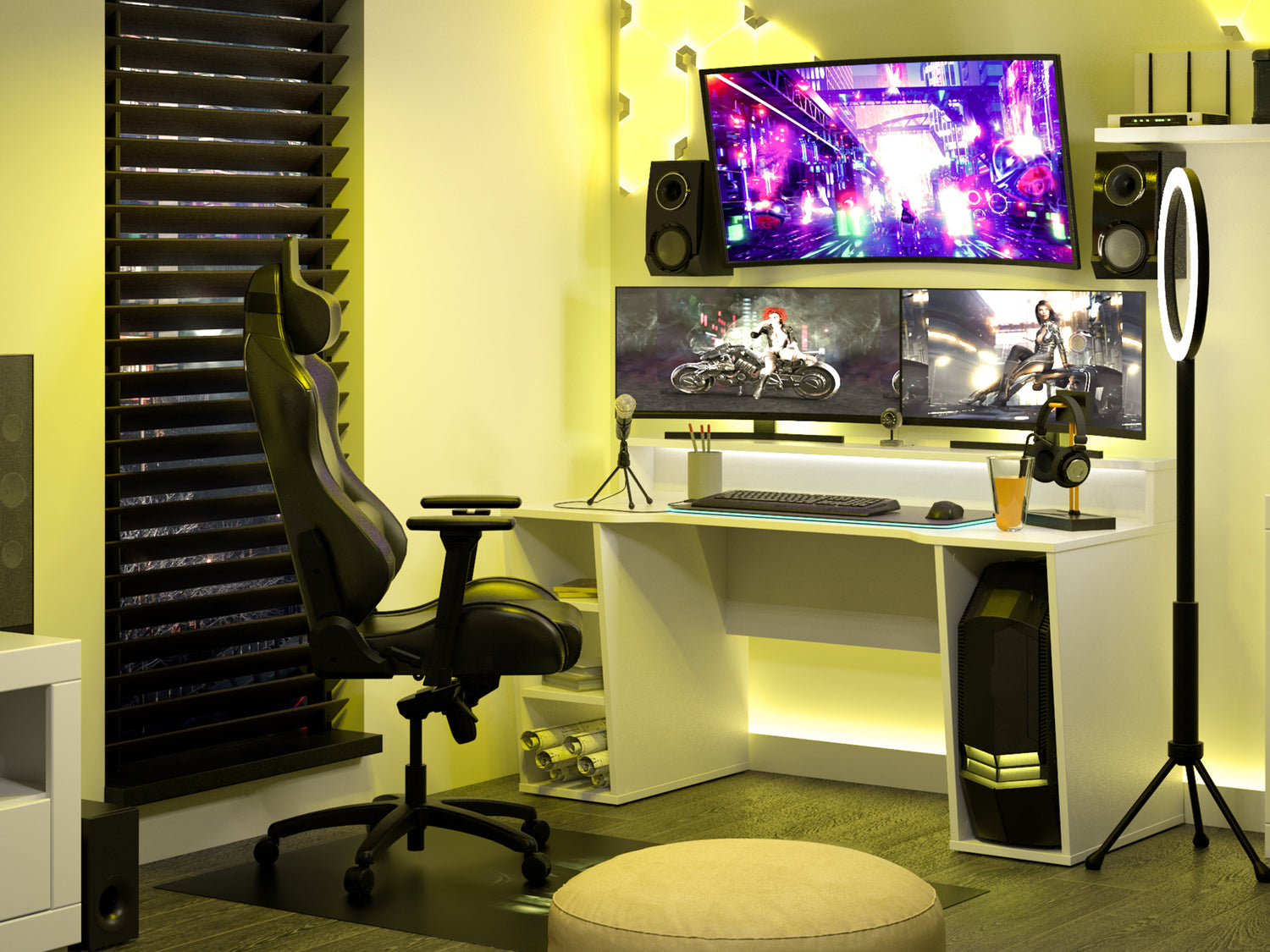 Zacznijmy od Twojego centrum dowodzenia, musisz mieć spory kawałek blatu do dsypozycji, żeby Ci go nie zabrakło przy próbie wycelowania w gracza drużyny przeciwnej! W tym wypadku my proponujemy nowoczesne biurko gamingowe białe, jego szerokość zadowoli Ciebie, Twoją klawiaturę i myszkę.