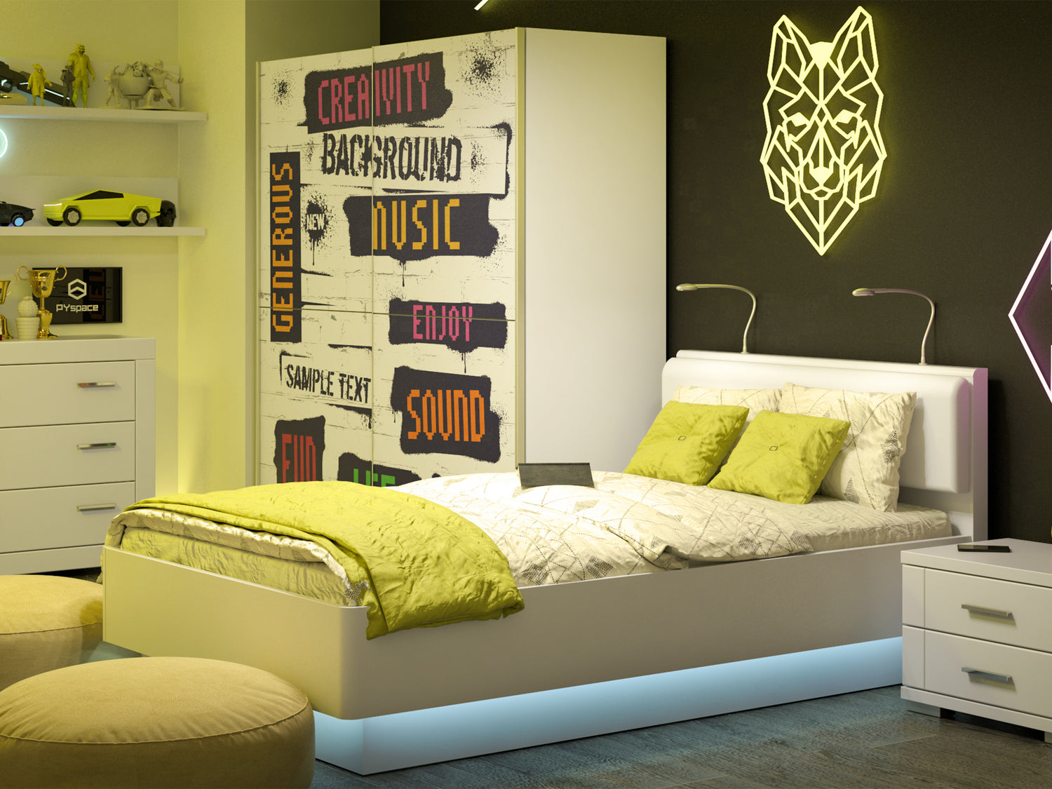 Czym byłoby miejsce do odpoczynku, jeżeli nie byłoby wydzielonej przestrzeni dla Twojego telefonu i magicznej szaty, ale po kolei. Telefon dziś śpi na szafce nocnej białej z dwiema szufladami. Szata, może się już szykować do spania, ponieważ ma przygotowaną miejscówkę VIP w szafie ubraniowej z młodzieżową grafiką, fanie co? :)