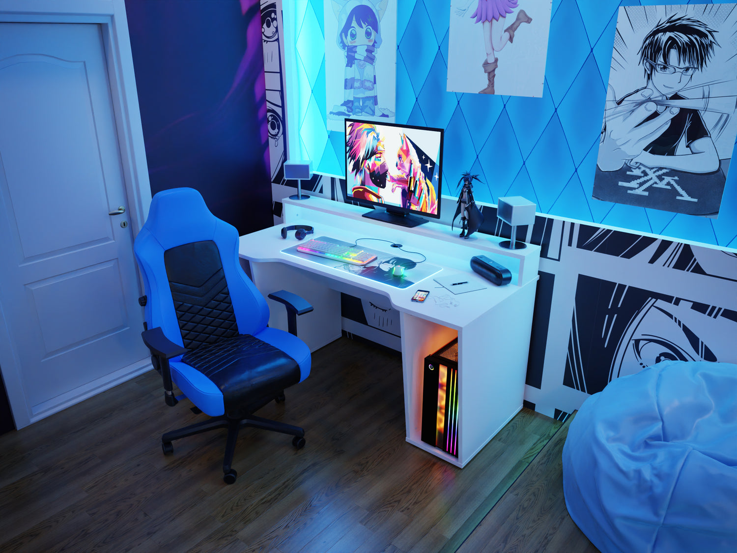 Zacznijmy od punktu centralnego Twojego pokoju gamingowego! Przecież wiadome jest, że jest nim strefa z biurkiem! W naszej aranżacji wykorzystaliśmy nowoczesne biurko gamingowe białe. Jak widzisz świetnie wpisuje się w ten klimat, a LED'y na ścianie tylko podkręcają klimat. Nie wspominając o plakatach, które dobrze dobrane pomogą Ci się przenieść do kraju Kwitnącej Wiśni