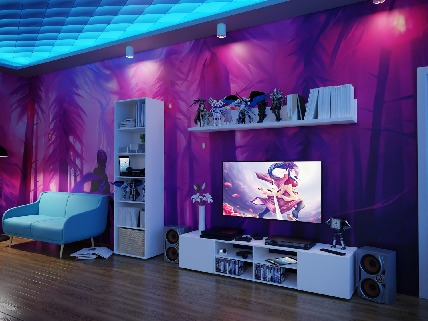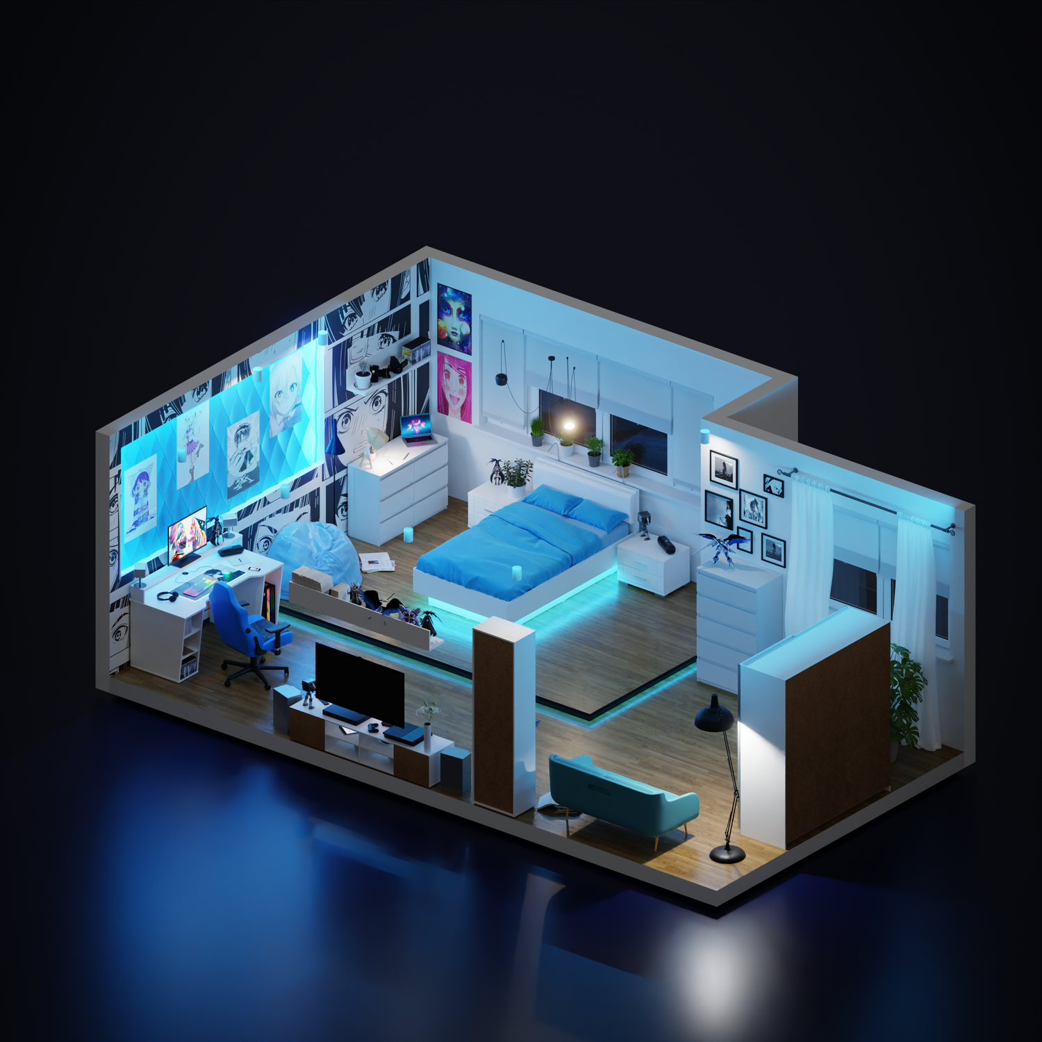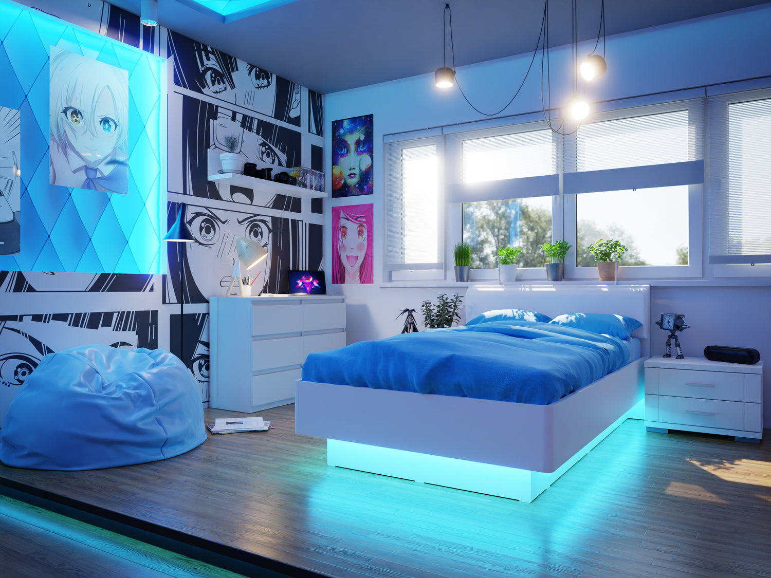 To jest nasz pomysł na niebieski pokój w stylu anime. Położyliśmy tu duży nacisk na biel, LEDY i tematyczne plakaty, ale oczywiście Ty wybierz takie, które wyrażają Ciebie!