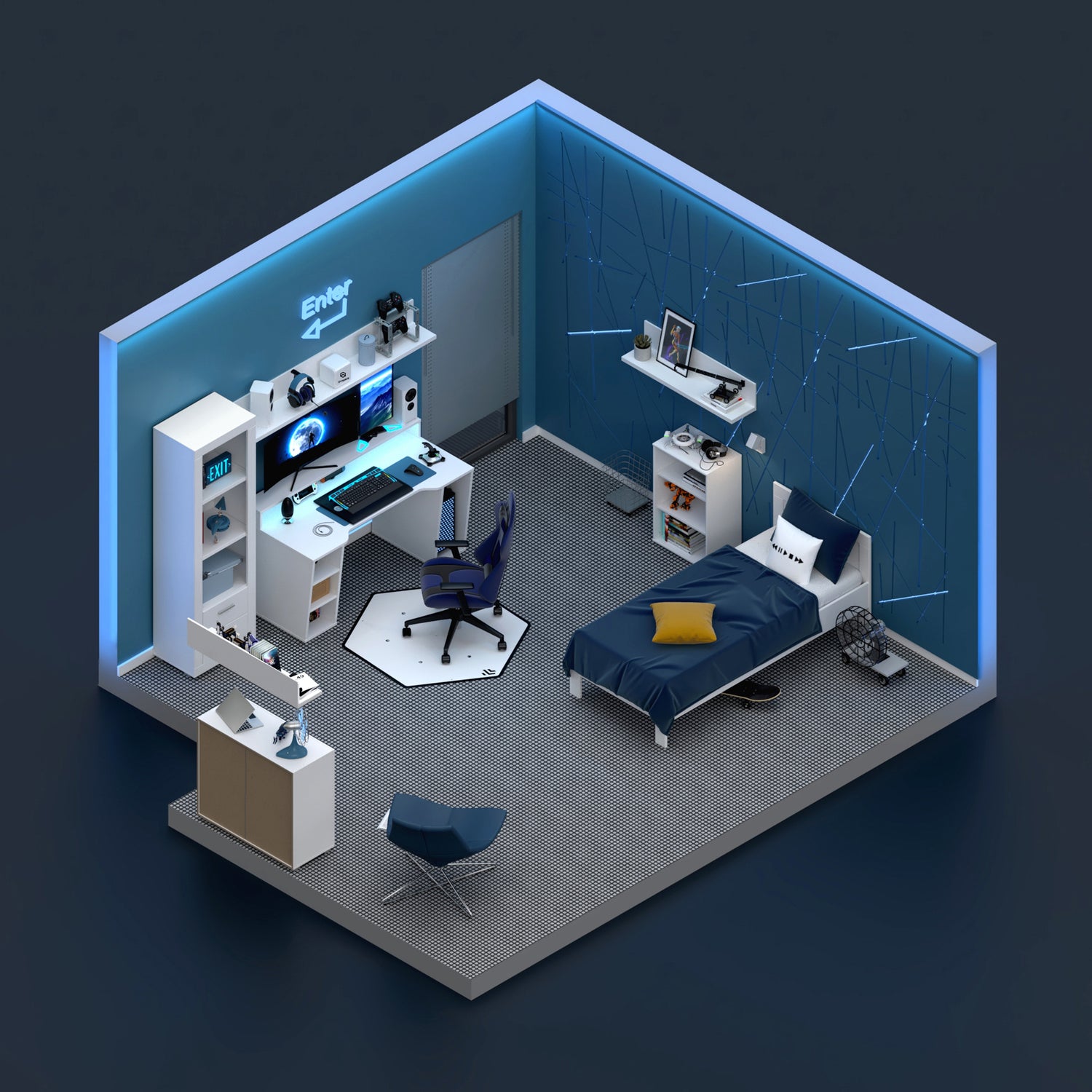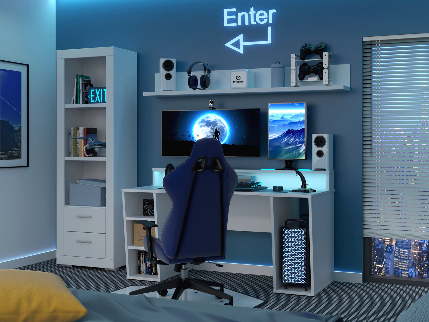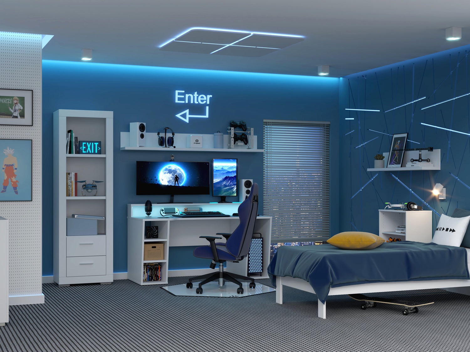 Oczywiście wiemy, że centrum każdego pokoju gaingowego jest strefa z biurkiem. To tu powstają najważniejsze plany następnej bity, rozmieszczenie ekipy na mapie, ale również tu są odrabiane lekcje, które są tak samo ważne jak przygotowanie do walki! Co najlepiej współgra z niebieskim kolorem? Wiadomo, że kolor biały, dlatego strefa planowania została wyposażona w nowoczesne biurko gamingowe białe, półkę wiszącą białą - 180 cm oraz biały regał z szufladami - masywna rama. To wszystko pomoże pomieścić wszystko co jest Ci potrzebne.