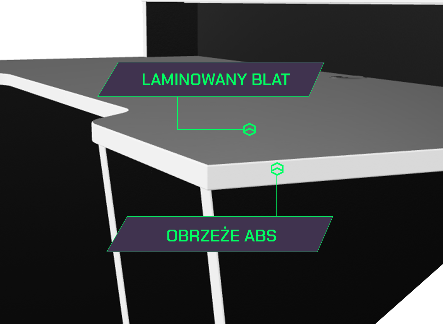Najwyższej jakości laminowany blat biurka jest odporny na zarysowania. Krawędzie są zabezpieczone trwałym obrzeżem ABS.