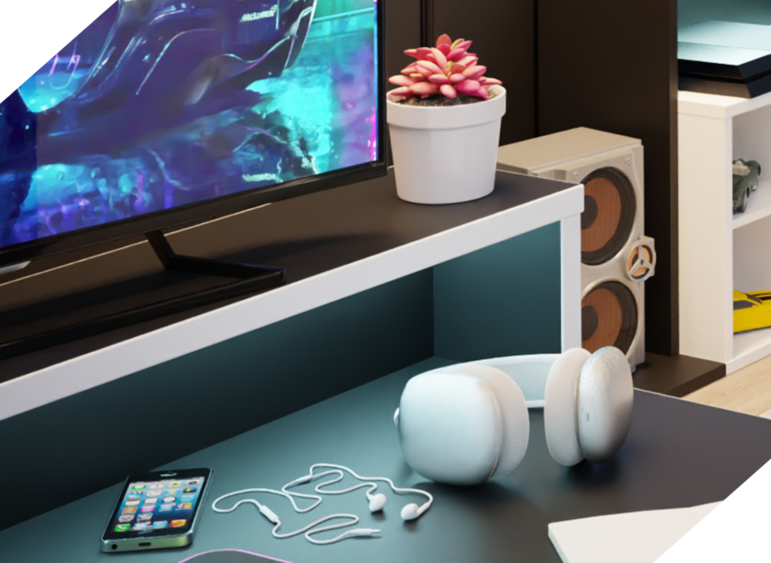 Dzięki ustawieniu monitorów na dedykowanej półce, zyskujesz dodatkową przestrzeń na blacie.