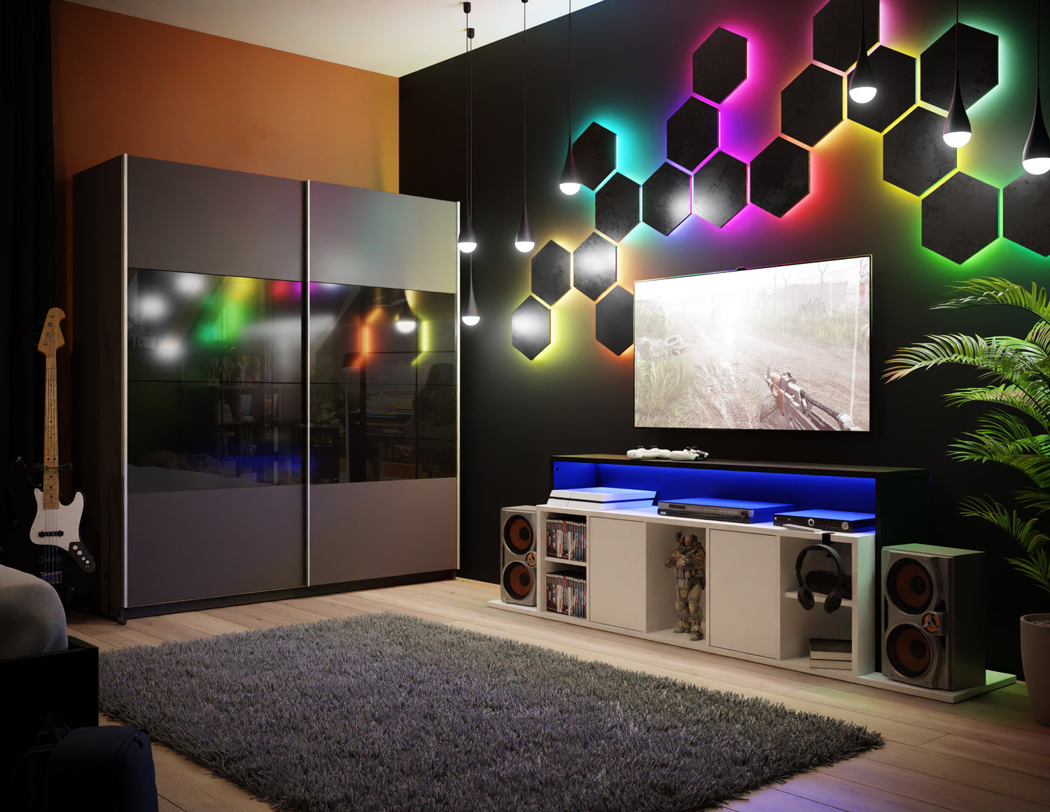 Lubimy jak wpadają do nas znajomi z Gildii, żebyśmy mogli trochę razem pograć i Ty pewnie też to lubisz! Przedstawiamy Ci idealnie przygotowane do tego stanowisko konsolowe składające się z nowoczesnej szafki RTV białej oraz niesamowitego oświetlenia ściennego RGB LED. Teraz razem możecie się przenieść w magiczną przygodę!