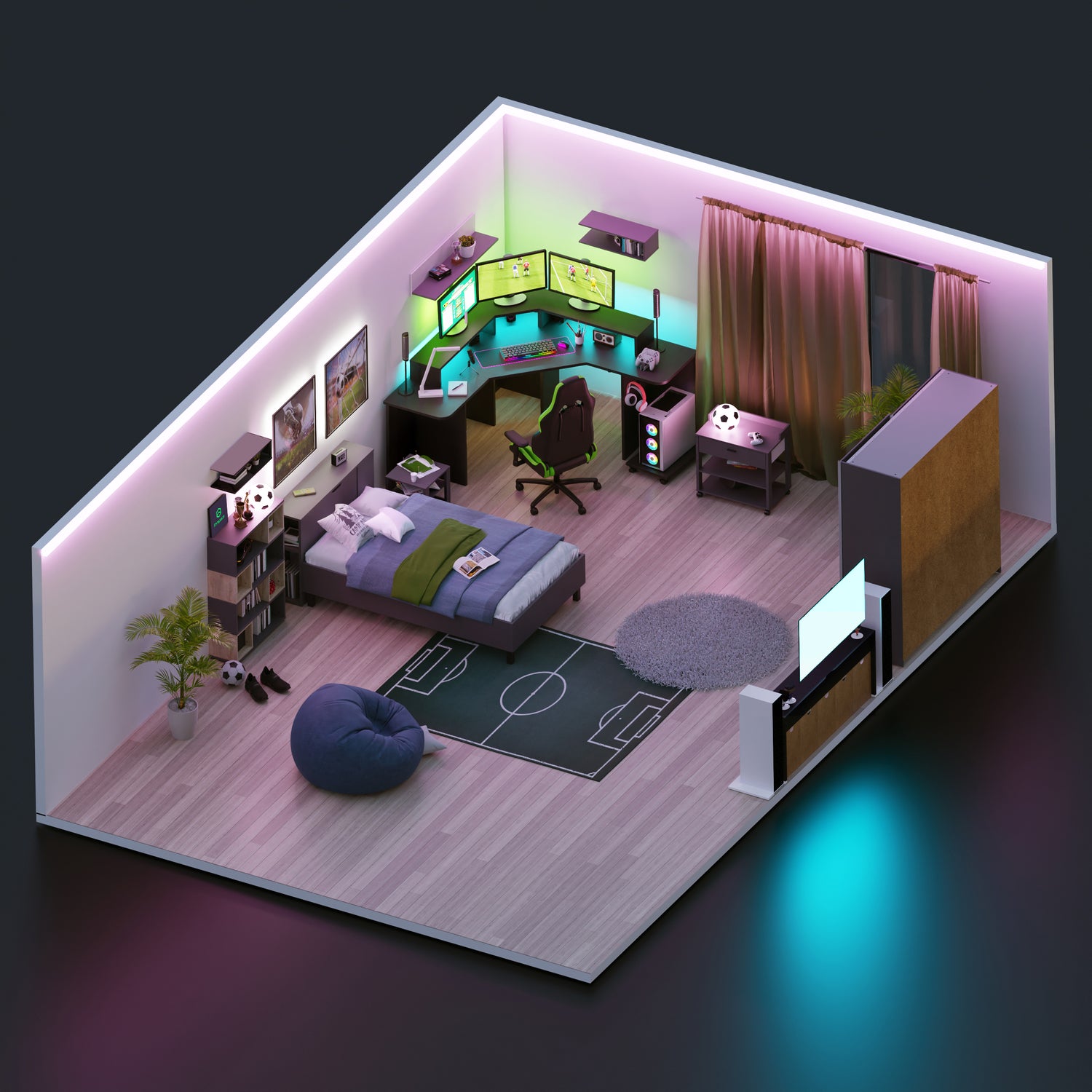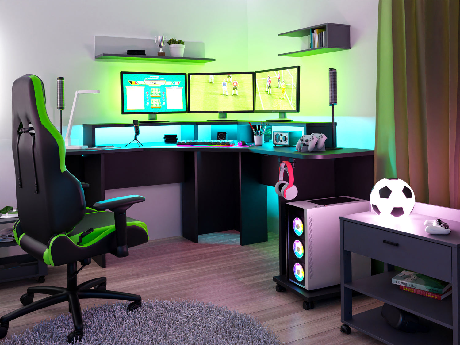 Oczywiście wiemy, że każdy prawdziwy gracz posiada swoje hobby, inne niż gry komputerowe i chciałby podkreślić to w swoim pokoju. Skupmy się tutaj na pokoju dla fana piłki nożnej! Jak widzisz wykorzystaliśmy narożne biurko gamingowe czarne 160 cm oraz szary kontenerek na kółkach z szufladą, które wpisują się w ten obrazek świetnie. Dlaczego? Bo wykończyliśmy tą aranżację przy użyciu zielonego oświetlenia LED jak również lampki w kształcie piłki. To właśnie takie elementy zaznaczają tematykę Twojego pokoju! A dzięki bardzo dużej przestrzeni będziesz miał miejsce na odrabianie lekcji, grę w ulubionego menedżera piłkarskiego i oglądanie meczu.