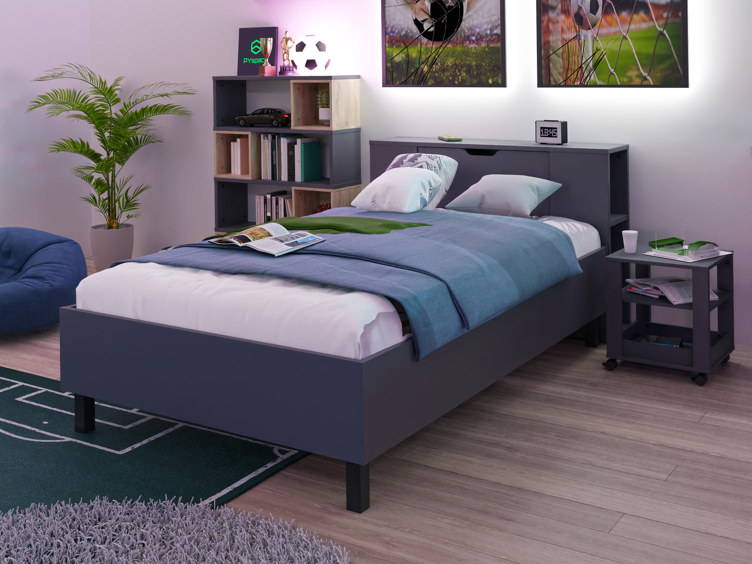 Każdy z nas potrzebuje odpoczynku, przecież nie jesteśmy robotami prawda? Jak najbardziej przewidzieliśmy również miejsce wypoczynku po każdej ważnej rozgrywce czy po dniu meczowym! Wyposażyliśmy je w komfortowe łóżko szare rama a za jego plecami postawiliśmy szary regał z szafką i wnękami oraz szary kontenerek na kółkach z szufladą, który może z Tobą jeździć po całym pokoju!