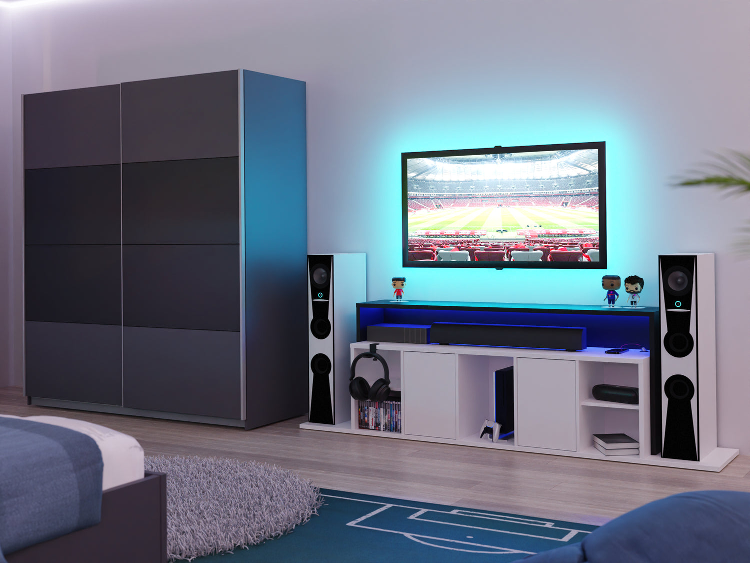 Wracasz z kolegami ze szkoły do Ciebie, żeby pyknąć mecz w fifę? Przedstawiamy Ci idealnie skomponowane do tego stanowisko konsolowe! Wyposażyliśmy je w nowoczesną szafkę RTV białą oraz dużą szafę ubraniową czarno-szarą. Ten duet jest tak dobry jak legendarny gol Leo Messiego w pierwszym meczu półfinałowym Copa del Rey. W szafce RTV znajdzie się miejsce na konsolę, gierki, słuchawki, głośniki i inne gadżety. Szafa pomieści Twoje stroje meczowe i ubrania do szkoły.