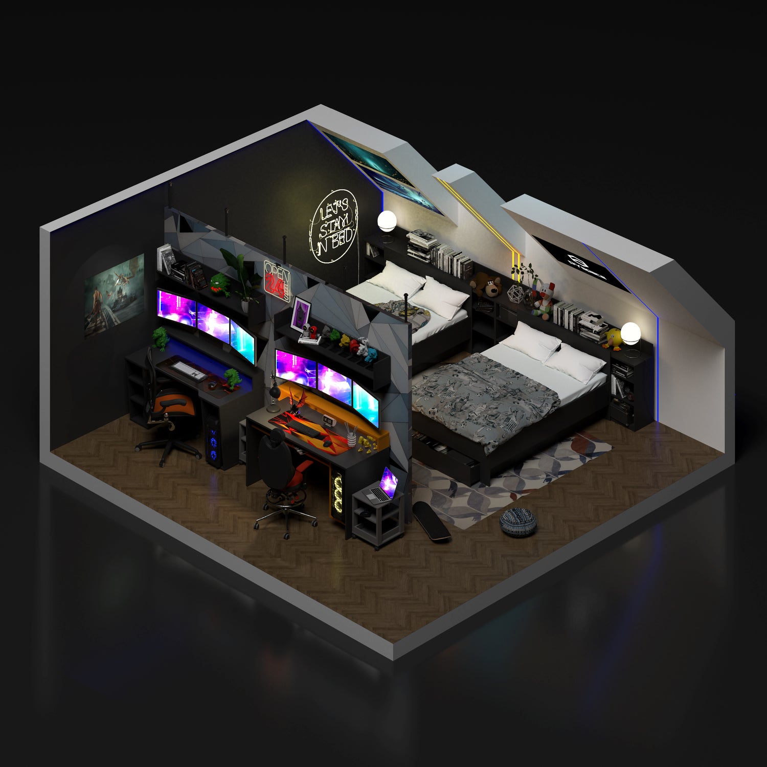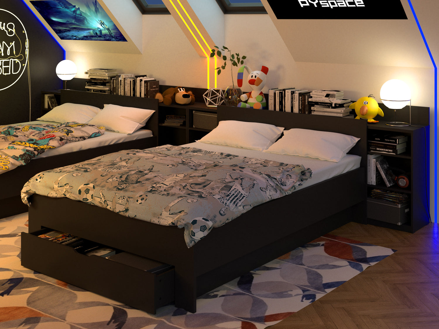 Jeżeli szukacie czegoś co idealnie się wpasuje w Wasz pokój gamingowy dla rodzeństwa to mamy dla was idealne rozwiązanie. Wiemy jak ważnym elementem pokoju jest miejsce na spawn. Spokojnie, nie zapomnieliśmy o tym. Każdy z Was dostaje swoje własne łóżko czarne młodzieżowe- rama z zagłówkiem i półkami i to jakie! Kliknij i sprawdź!