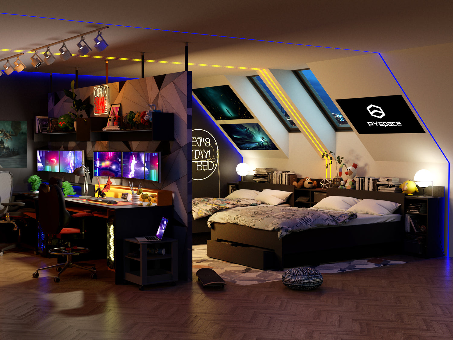 Jest to wyłącznie nasz pomysł, jak można fajnie połączyć pokój dla rodzeństwa, który ma służyć do nauki spełniać i wymogi prawdziwego pokoju gracza.