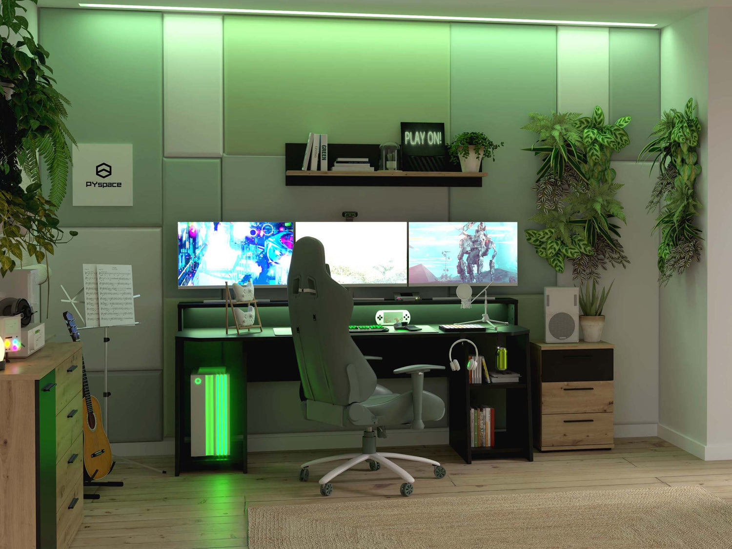 Jak wszyscy wiemy sercem pokoju prawdziwego gracza jest stanowisko komputerowe. Musi ono być wyposażone we wszystko co jest nam niezbędne. Począwszy od biurka, przechodząc przez dodatkowe półki, kontenerki i komody. W naszej inspiracji jaką jest pokój gamignowy z roślinami i elementami w kolorze drewna wykorzystaliśmy Szerokie biurko gamingowe z półkami - czarne 200 cm ze względu na jego wielkość, jesteśmy pewni, że uniesie wszystko co jest niezbędne, ale znajdzie się tam również miejsce na książki i zeszyty. W momencie, kiedy będziesz musiała je schować dodaliśmy szafkę z szufladami w kolorze dębu! Pomieści Twoje książki i zeszyty w momencie, kiedy Ty przeradzasz się w amazonkę walczącą o swoje tereny! Oczywiście nie zapomnieliśmy o fanach muzyki, którzy w wolne wieczory uwielbiają tworzyć coś nowego! Jak widzisz przy Twoim nowym stanowisku komputerowym, znajdzie się również miejsce na gitarę. Teraz bez problemu możesz przełączać się z trybu gracza, na tryb muzyka!