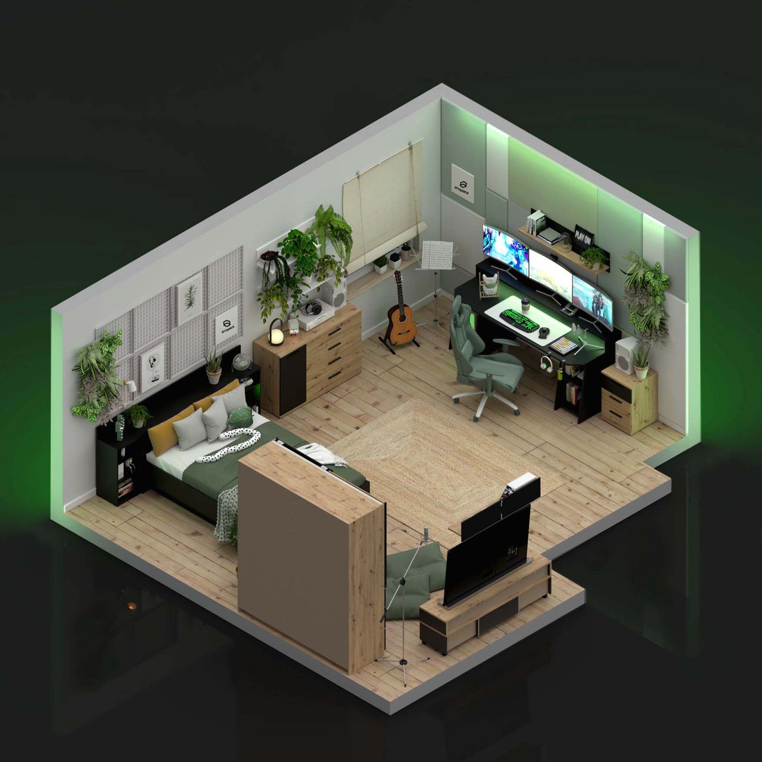Chcemy tylko powiedzieć, że pokój gamignowy z roślinami i elementami w kolorze drewna jaki stworzyliśmy jest naszym pomysłem na pokój, gdzie perfekcyjnie współgra ze sobą zieleń wszechobecnej roślinności, ale również oświetlenia LED i wyposażenie gamingowego pomieszczenia. Czasami wystarczy chwilkę się zastanowić i gwarantujemy Ci, że wszystko można połączyć!