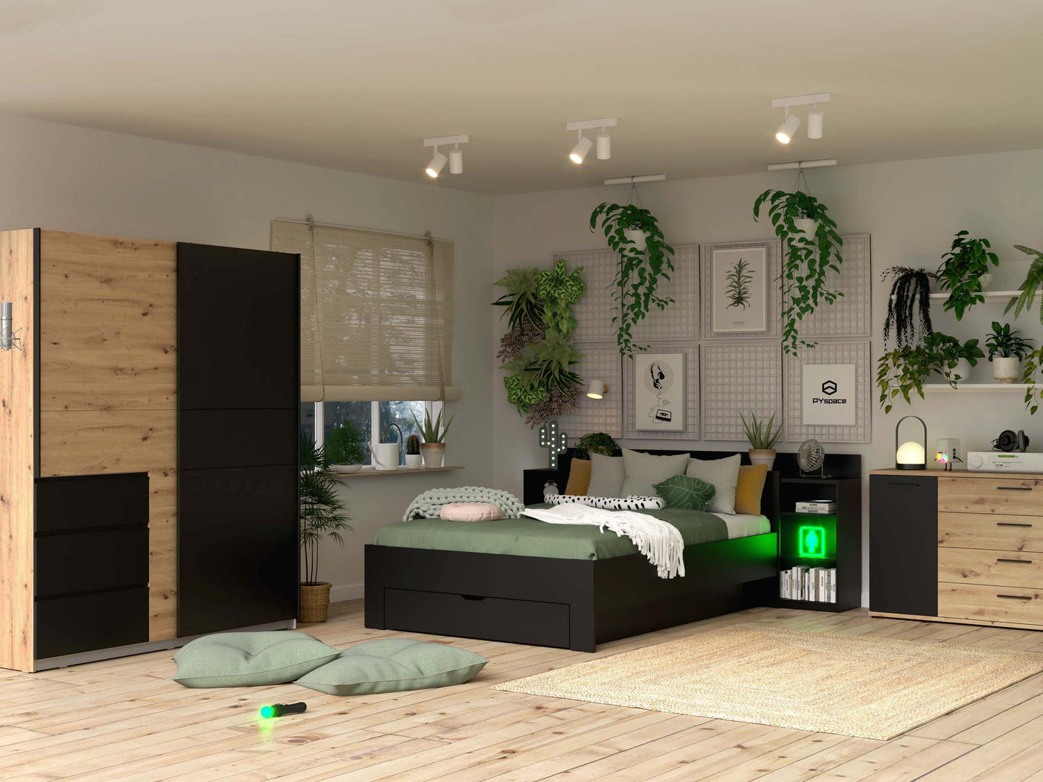 Każda wojowniczka potrzebuje czasami schować swoją włócznie i po prostu odpocząć. Teraz dajemy Ci tą możliwość z naszym nieziemsko wygodnym łóżkiem czarnym młodzieżowym posiadającym ramę z zagłówkiem i półkami. Tutaj poczujesz się dosłownie jakbyś spała na mięciutkiej chmurce. Dodatkowo pokój gamignowy z roślinami i elementami w kolorze drewna w strefie z łóżkiem posiada też szafę ubraniową w kolorze dębu i czerni, aby twoja włócznia i topór też mogły się spokojnie wyspać i przygotować na kolejny dzień!