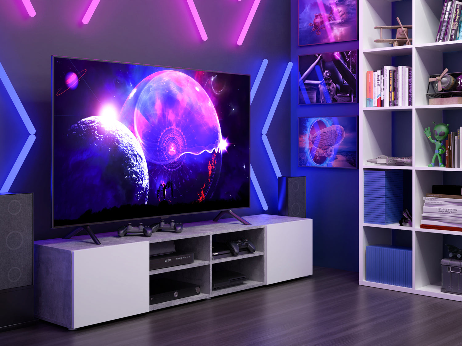 Ktoś mógłby pomyśleć, że idealne stanowisko konsolowe nie istnieje, że to święty grall dla graczy. Teraz pojawiamy się my z naszą inspiracją pokoju ze stanowiskiem konsolowym. Spójrz jak świetnie współgrają ze sobą ledy w odcieniach fioletu, niebieskiego, oraz białe mebelki jakich użyliśmy tj. szafka RTV w kolorze betonu z białymi frontami oraz duży regał biały - 15 wnęk. To wszystko tworzy niesamowitą, magiczną całość, która pomoże Ci przenieść się w świat ulubionej gry.