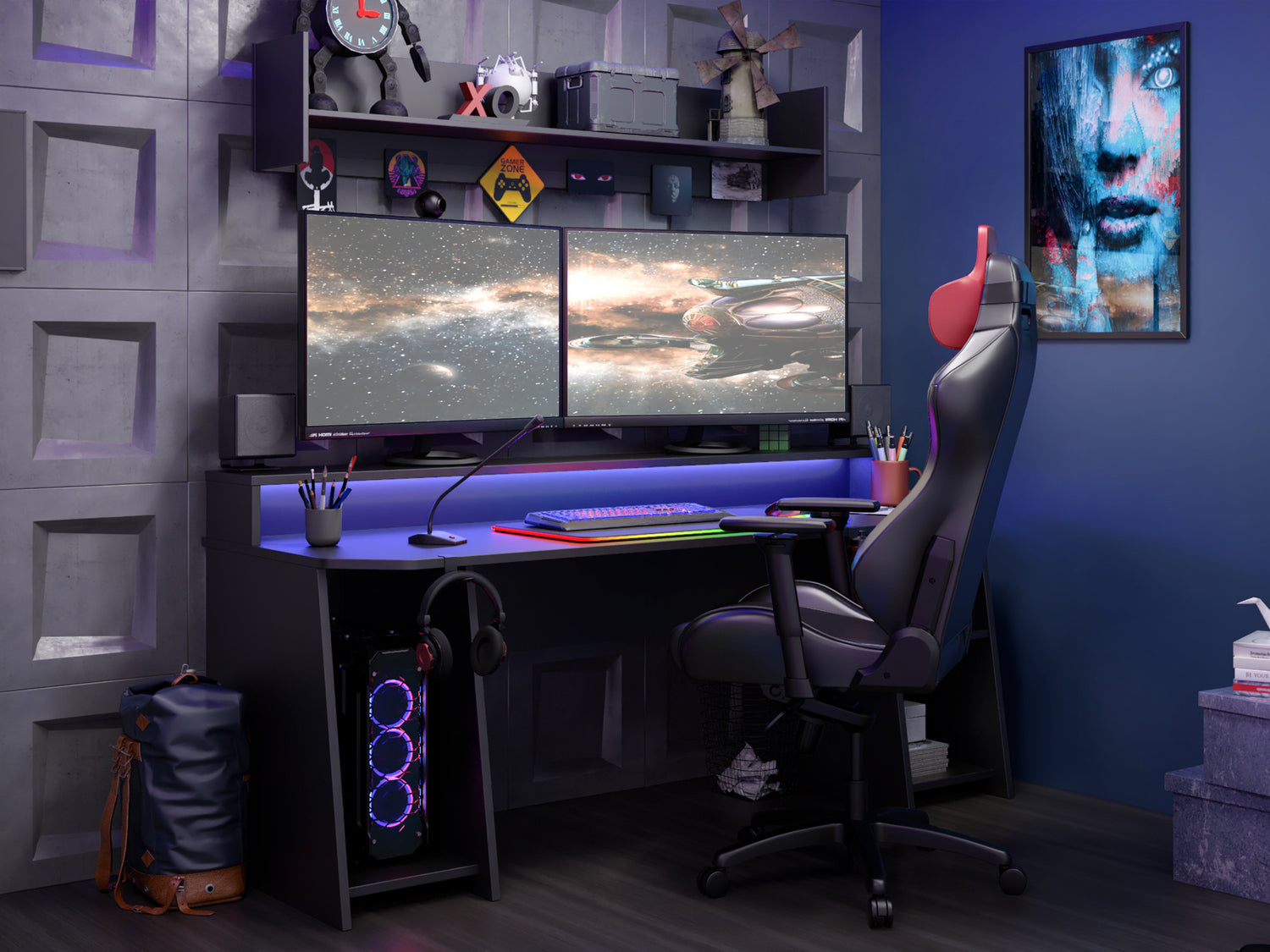 Chcemy Ci pokazać jak w całości może wyglądać pokój ze stanowiskiem konsolowym. Jak widzisz znajdzie się tu miejsce na wszystko. Zmieścisz tu swoją konsolę, komputer, deskorolkę czy nawet bierki! Poza tym wszystkim najważniejsze jest dla nas, że przy tak dużym biurku i w zacisznym miejscu, będziesz miał swój kąt również na naukę i odrabianie lekcji!