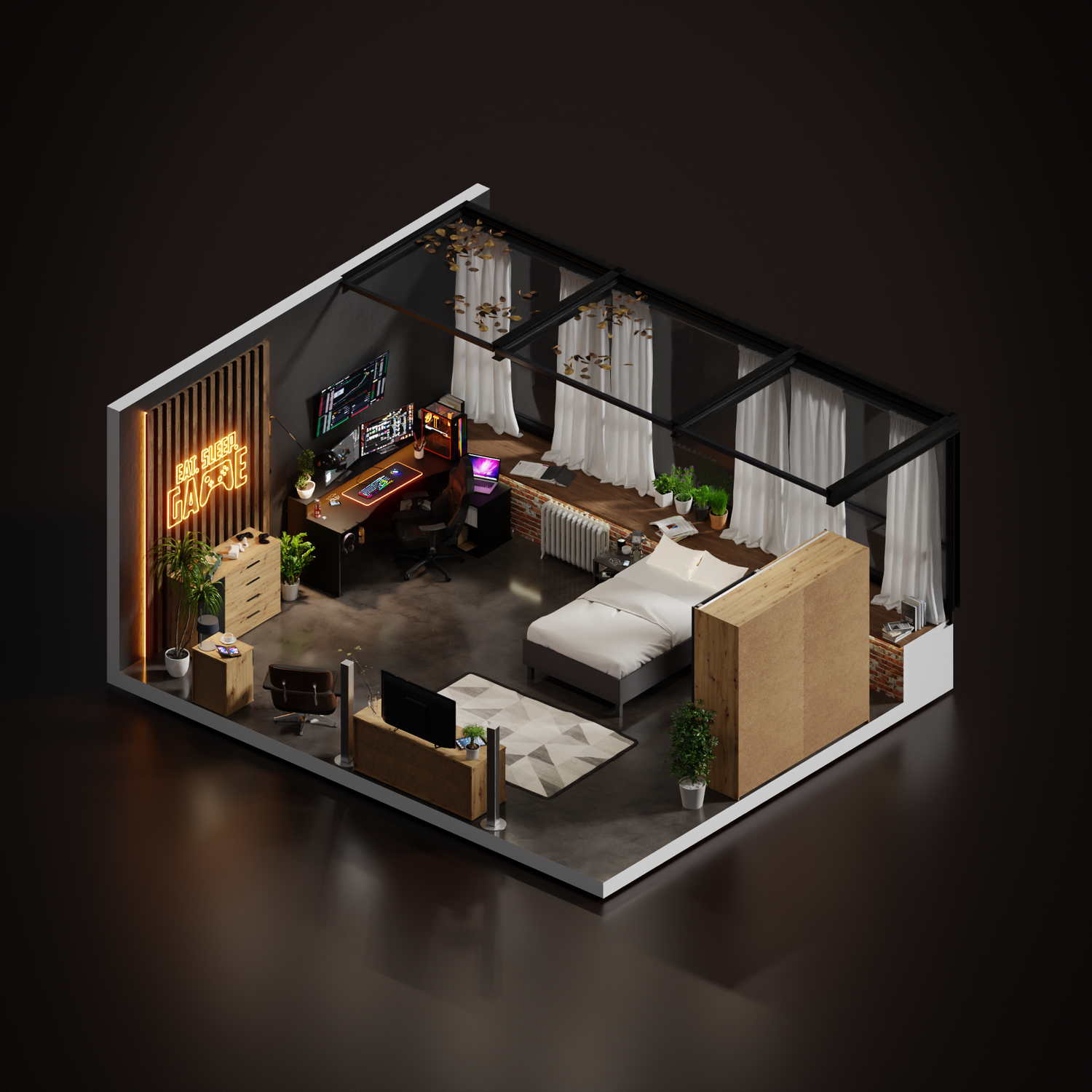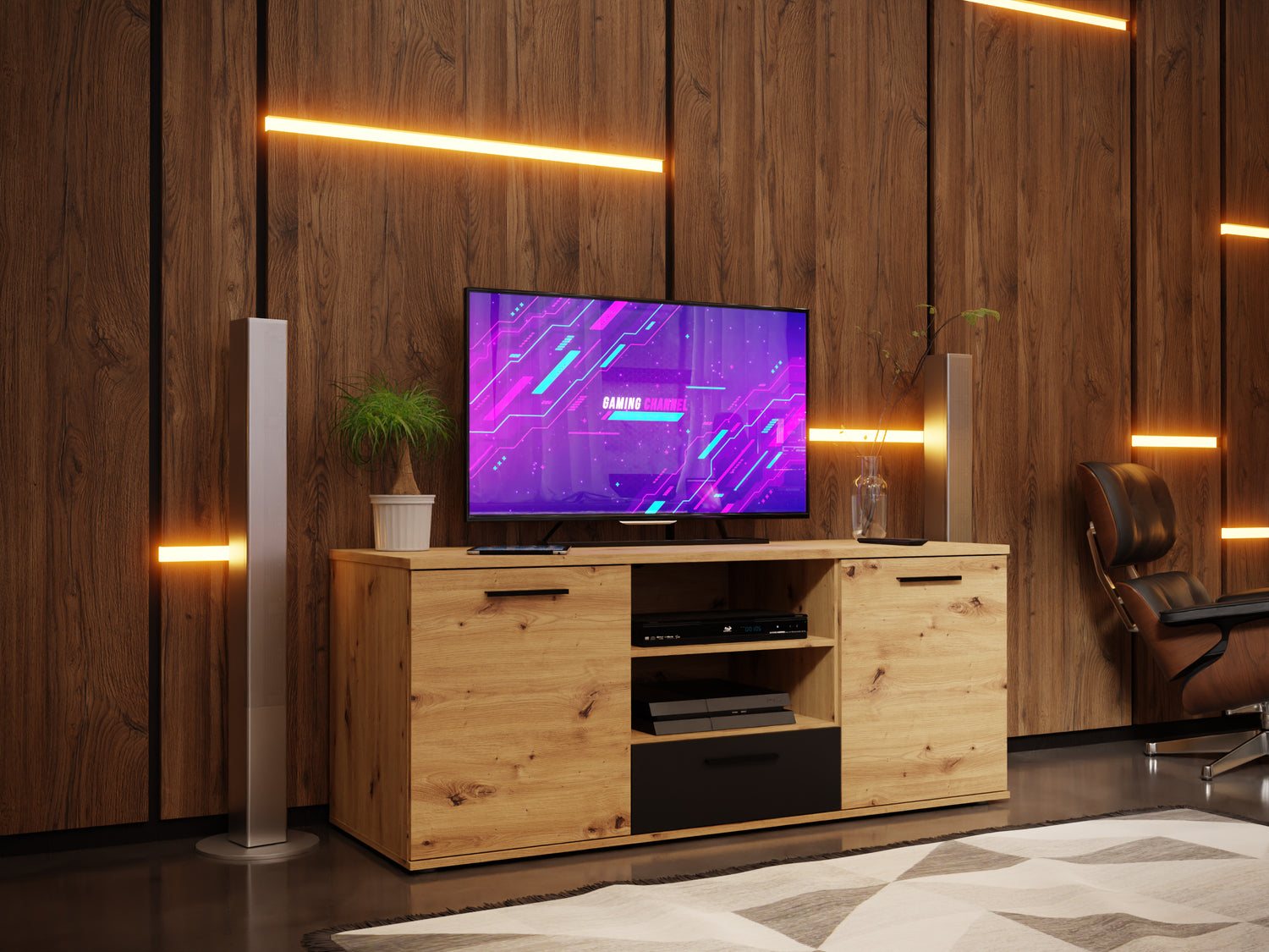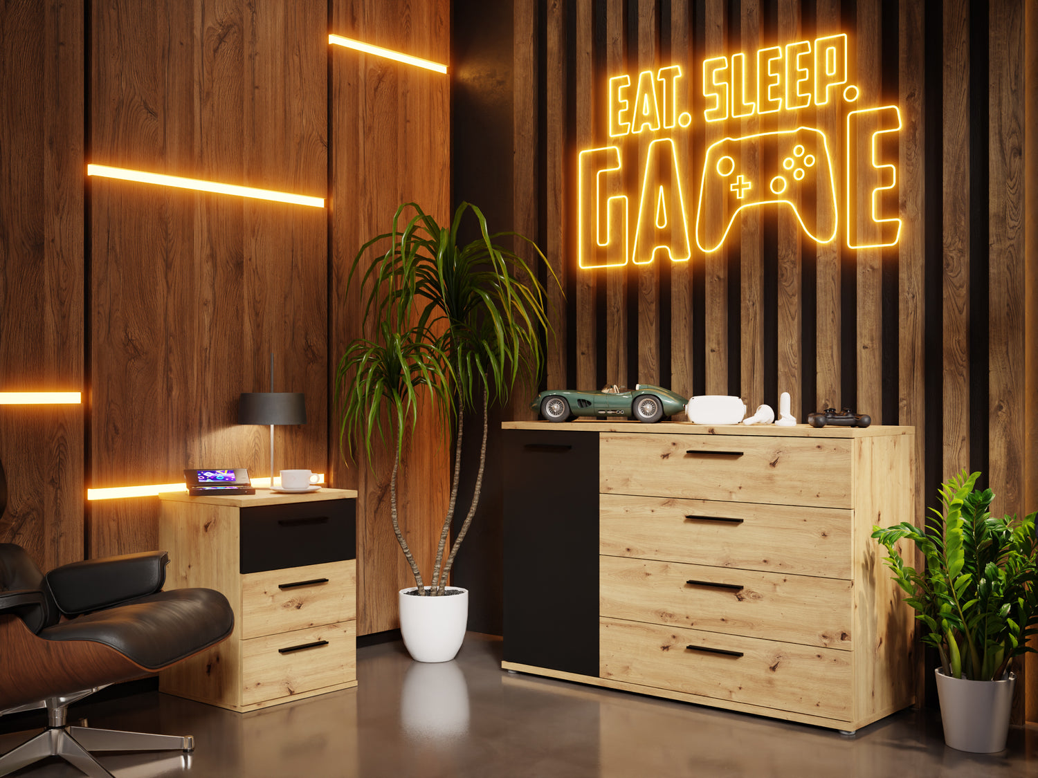 W naszej inspiracjij przygotowaliśmy specjalne stanowisko konsolowe! Niedość, że wygląda świetnie to dzięki wykorzystaniu przez nas szafki RTV w kolorze dębu z szafkami oraz wykończenia ścian w dekorze drewna, dodaje Ci magicznej aury. To Twój czas druidzie! Naładuj manę i do dzieła! Warto zaznaczyć, że punktowe LEDy na ścianie, podnoszą punktację wizualu tego pokoju o 10 pkt.