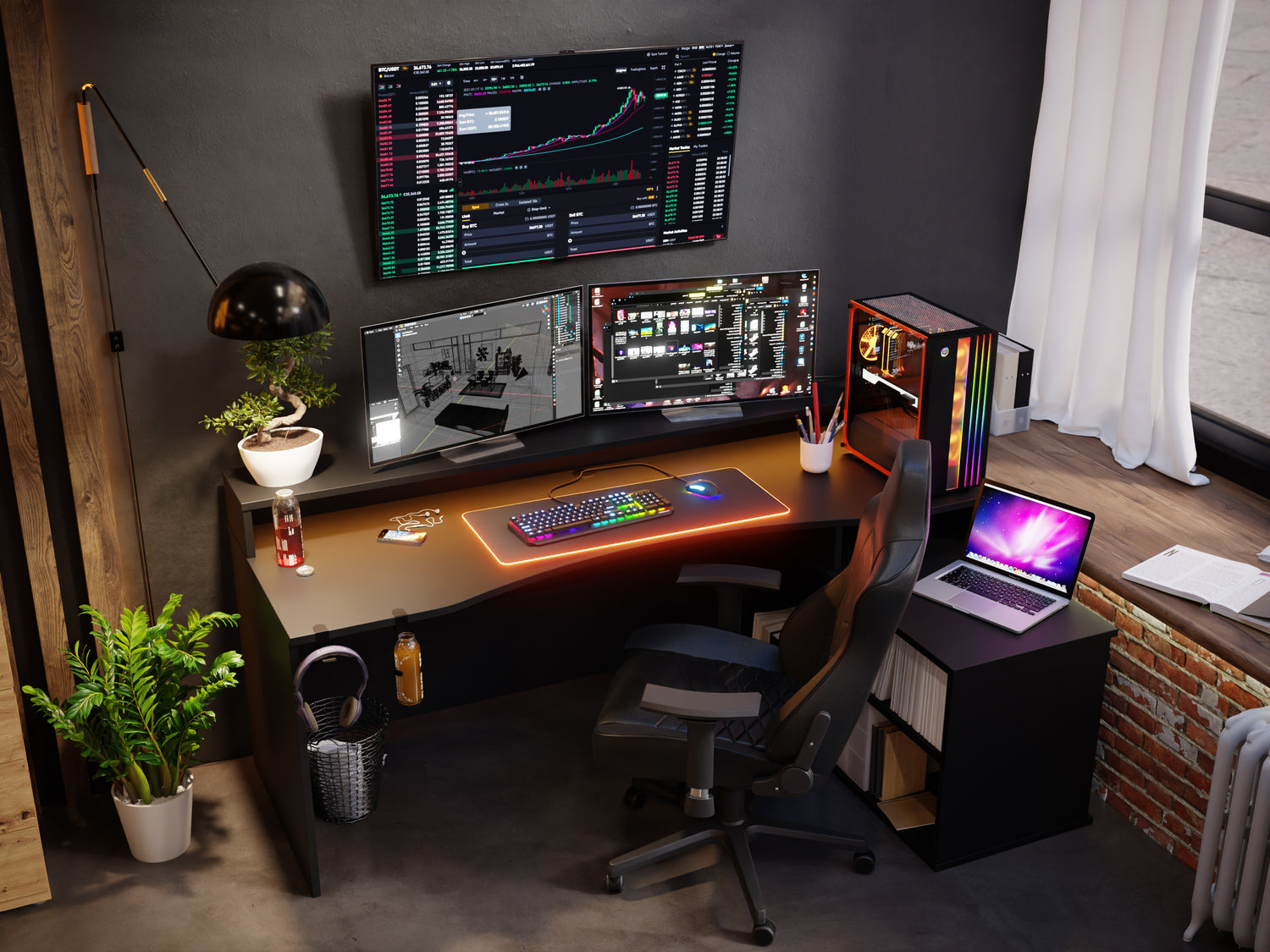 Marzy Ci się idealne stanowisko komputerowe, które w ciągu dnia będzie spełniało rolę stanowiska do homeoffice? Wystarczy, że wybierzesz duże czarne biurko gamingowe z pólkami - 200 cm, dodasz do tego drewniane elementy, czarną ścianę i buuum! Masz stanowisko do HO, które nocą niczym Batman, dzięki idealnym wymiarom i oświetleniu LED zamienia się w wymarzone stanowisko gamingowe!