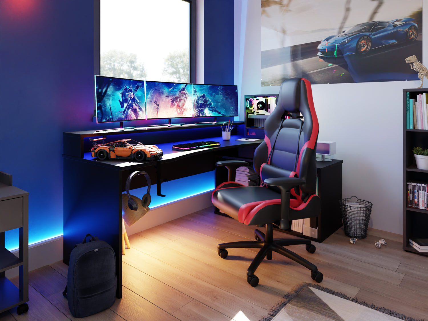 Biurko bez kółek też się znajdzie, ponieważ pokój gamingowy powinien być wszechstronny! Jeśli potrzebujesz ‘kawałka stołu’ do homeoffice, albo solidnego stanowiska dla streamera, proponujemy duże czarne biurko gamingowe z półkami - 200 cm. Spełnia kryteria ‘kawałka stołu’, a ponadto dysponuje półkami, które chętnie Ci pożyczy. Figurki, książki i płyty? Wszystko pod ręką!