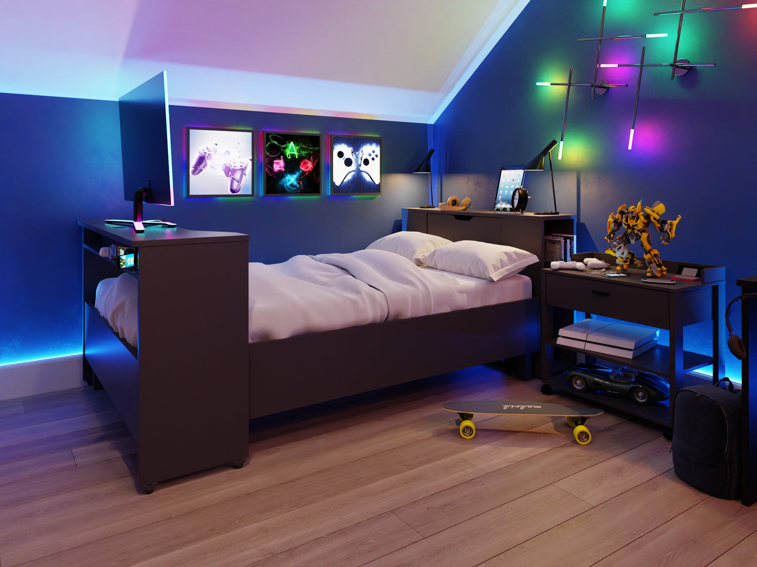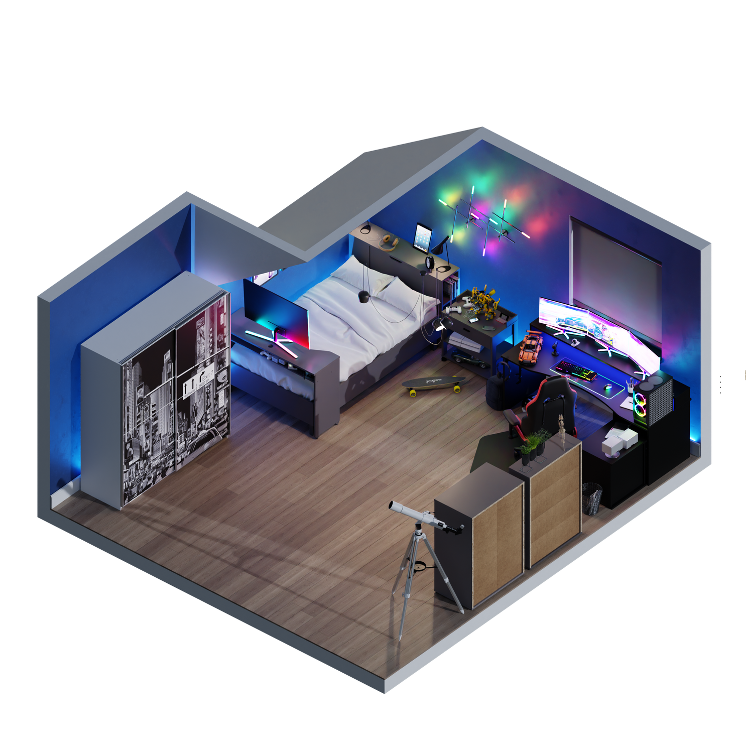 Bez właściciela nawet najbardziej gamingowy z gamingowych pokoi będzie okropnie pusty. Teraz Twój ruch! Trochę dodatków tu, trochę tam… Wszystkie figurki na wystawę, konsole, pady i płytki do szeregów. Plakaty i szybkie samochody dla dodatkowego speeda i… gotowe! Ten pokój żyje!