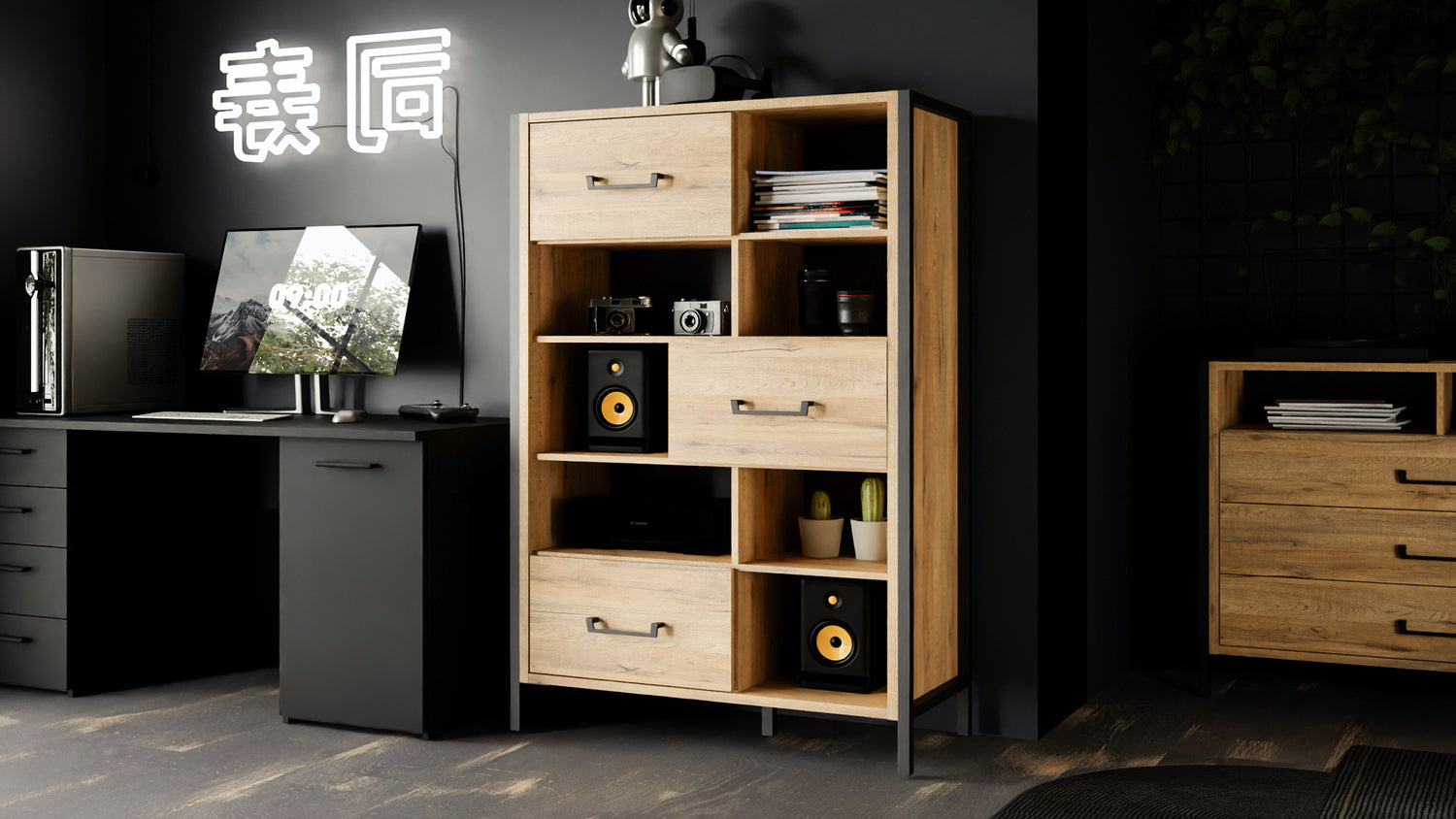 Zadbaliśmy o to, żeby w Waszych gamingowych sypialniach nie zabrakło odpowiednich schowków na ekwipunek! Dlatego, umieściliśmy w wizualizacji również przestronną szafę ubraniową BLACKDWARF824. Na bank pomieści ona wszystkie Wasze ubrania i wiele więcej! A… jeżeli miejsca by zabrakło, to zawsze jest jeszcze regał w kolorze drewna ZEMYA424 i komoda ZEMYA212. Do tego półka wisząca na wszystkie błyskotki i figurki… I gotowe!