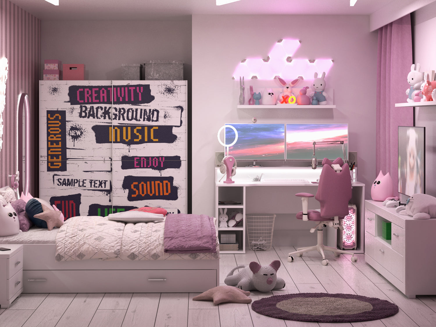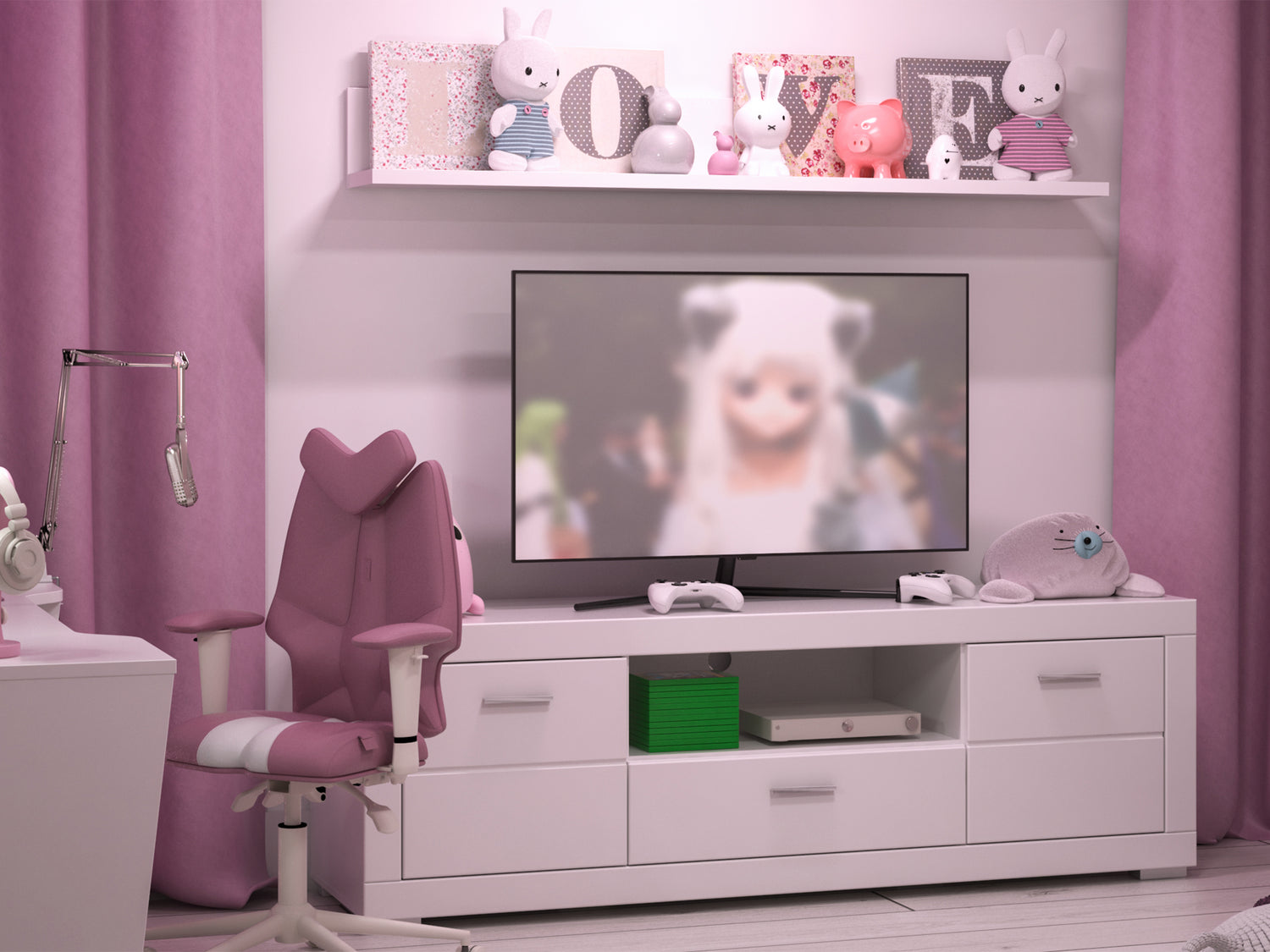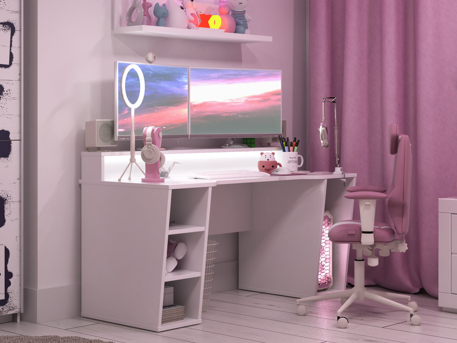 Biały pasuje do wszystkiego, a do różowego ekwipunku gamingowego to już w ogóle! Nowoczesne biurko gamingowe białe będzie służyć Ci czterema wnękami, w tym jedną, która stanie się domkiem dla Twojego PC. Jeśli zabraknie Ci półek pod blatem, półka wisząca biała - 110 cm zajmie się nadwyżką Twojego ekwipunku.
