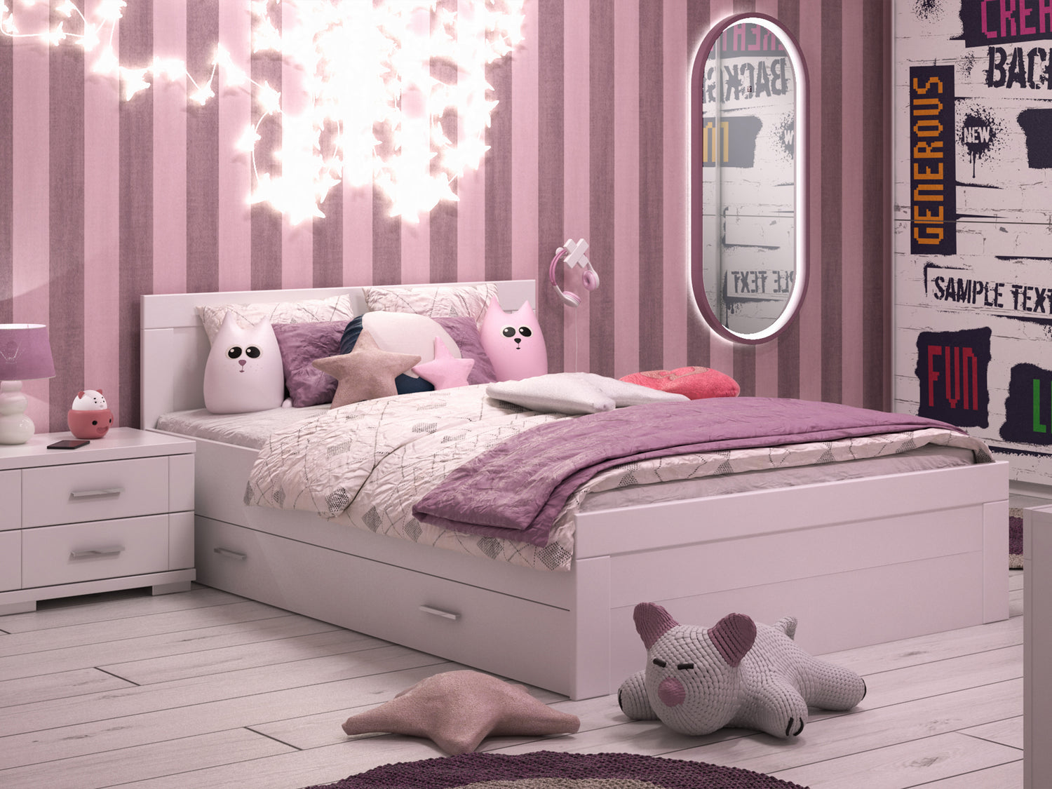 I to jakie! Łóżko białe 140x200 - rama na nóżkach – z drobnym upgradem, bo z szufladą do łóżka z blendą maskującą - białą. Stwórz w swoim różowym pokoju gamingowym komfortową i przytulną przestrzeń – im więcej kocyków, tym lepiej. Zawsze jest jeszcze trochę miejsca w szufladach! No, i jest jeszcze szafka nocna biała z dwoma szufladami, wszystko pod ręką!