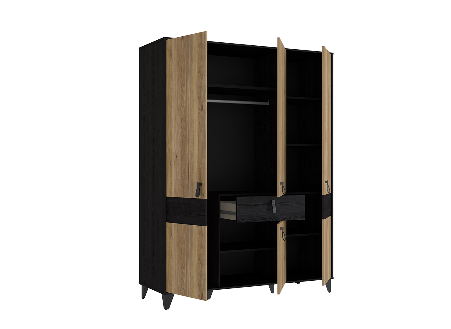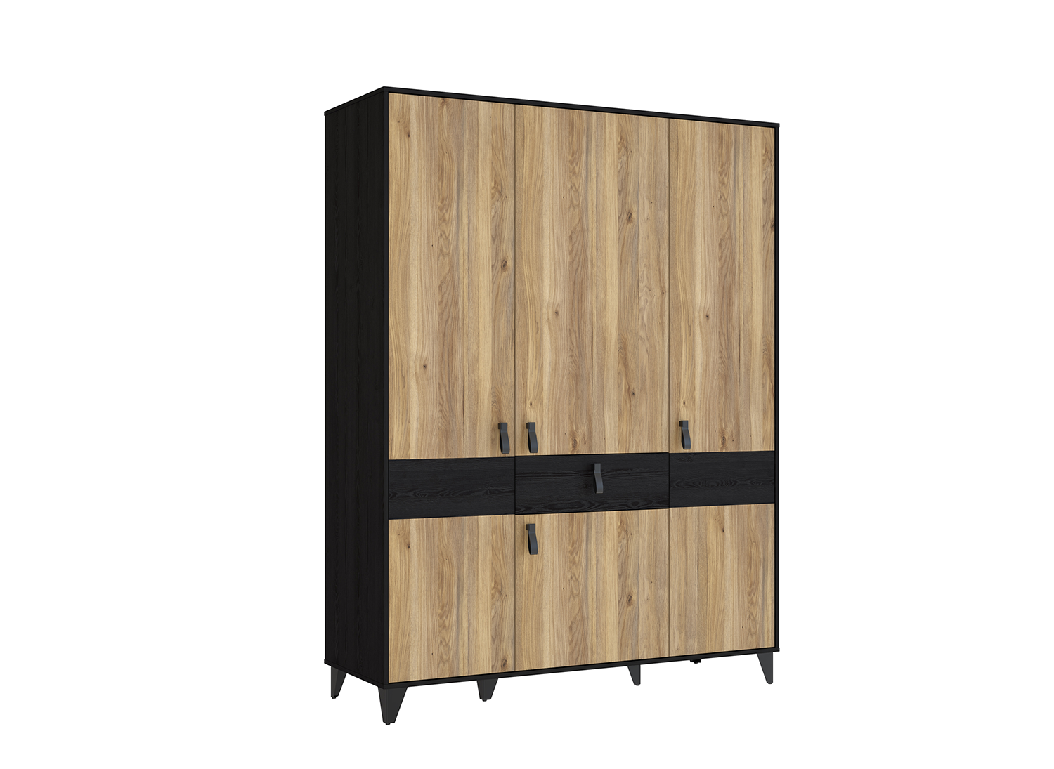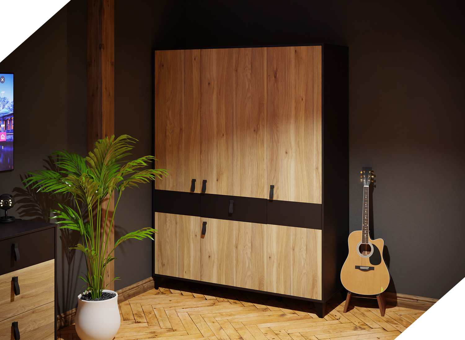 - Szafa ubraniowa w kolorze drewna i czerni BLACKDWARF831 łącząc kontrastowe kolory drewna i czerni wprowadza do Twojej przestrzeni stylowy i nowoczesny wygląd, wpasowując się do estetyki loftowej. Sprawi, że Twój pokój będzie wyglądał ciekawie i unikalnie.