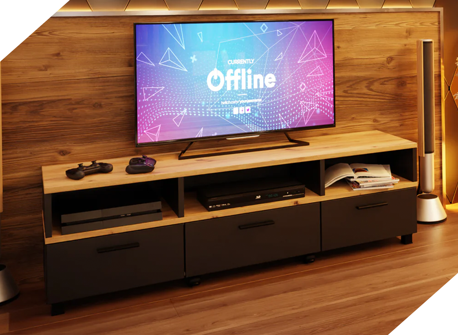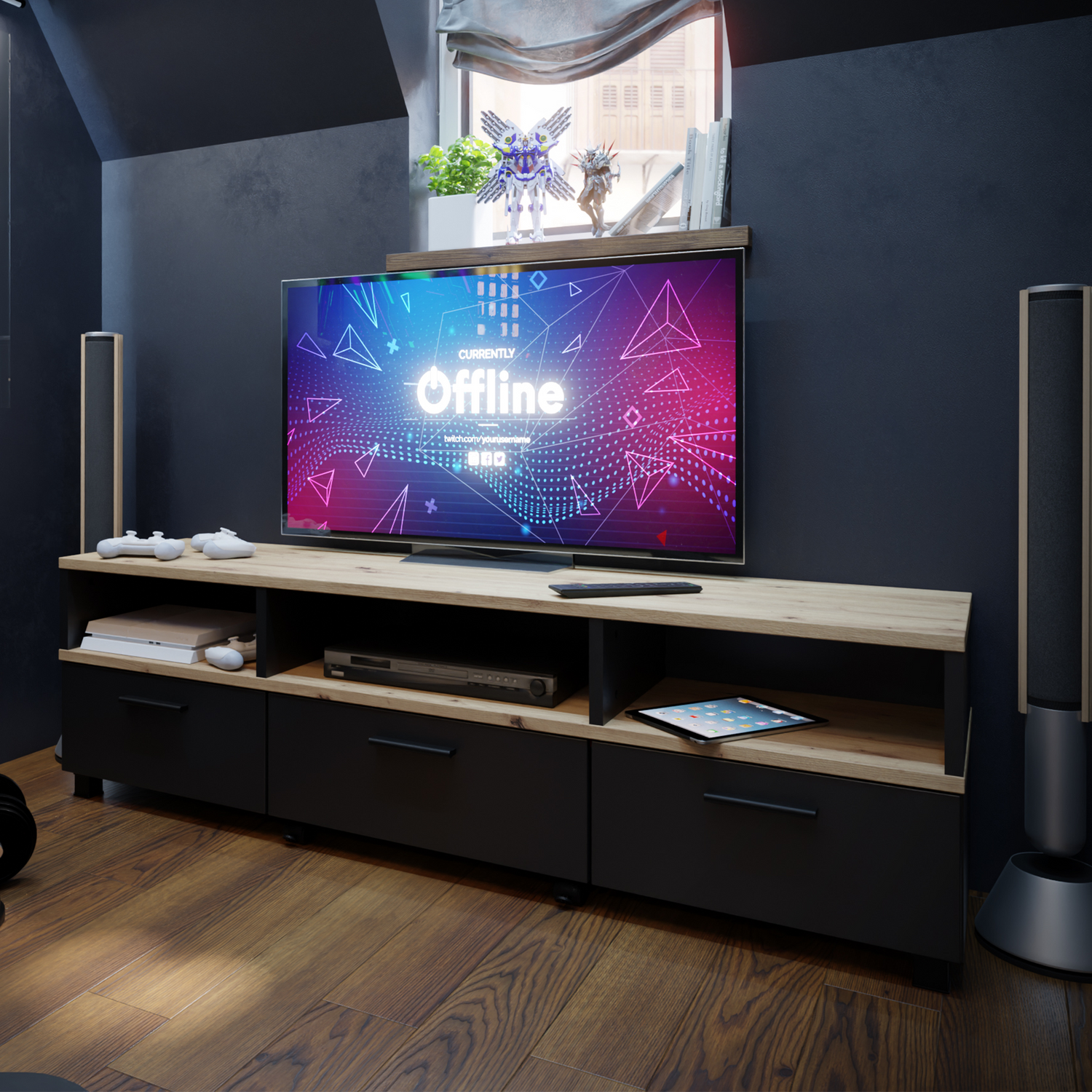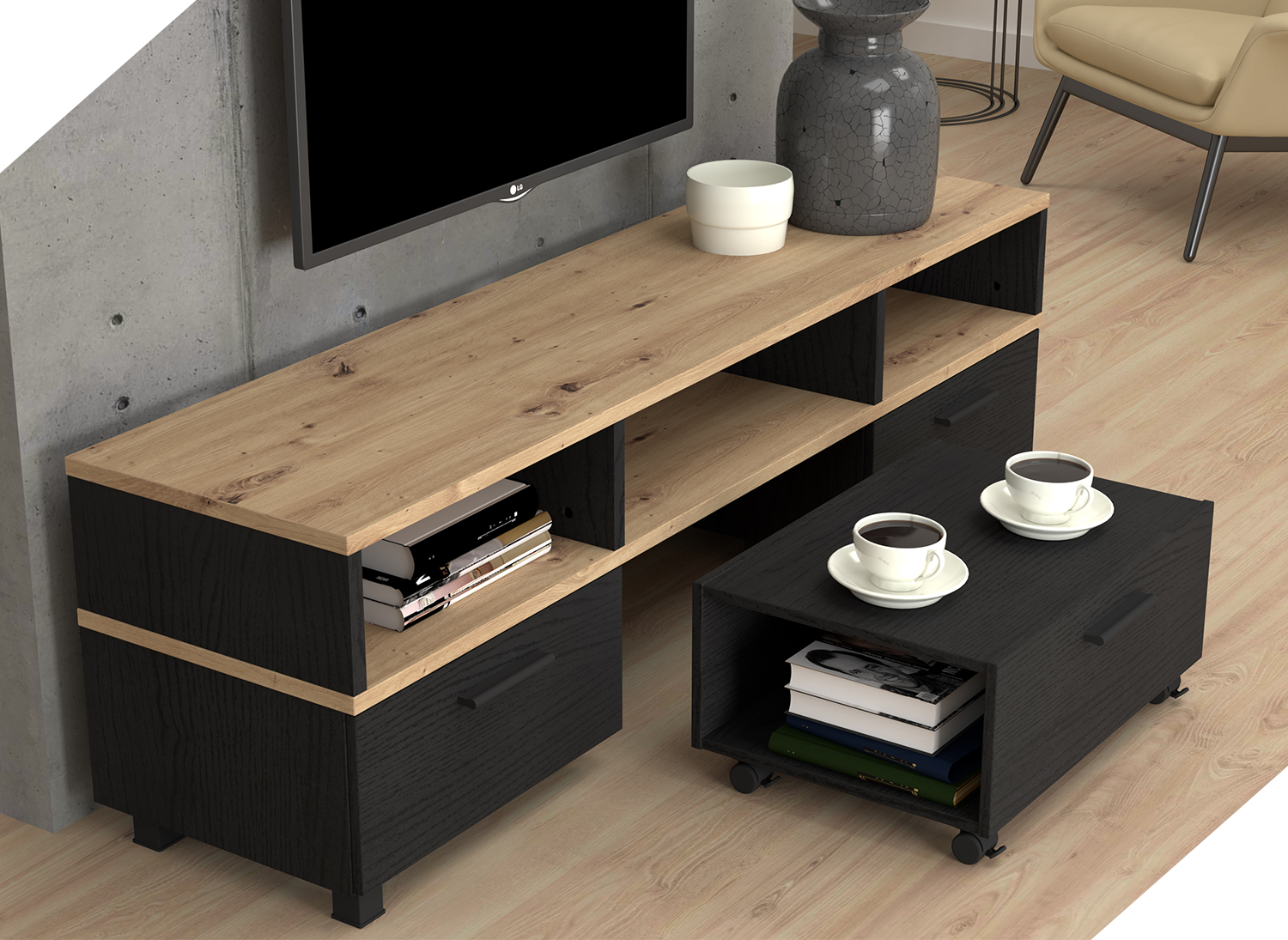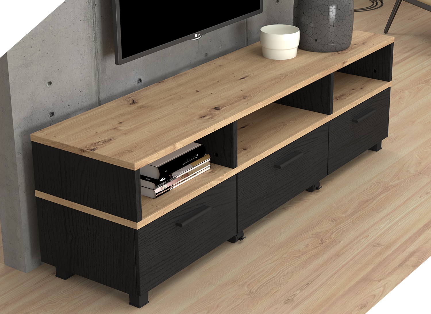 Uniwersalność i wszechstronność szafki RTV w kolorze czerni i dębu sprawiają, że doskonale pasuje do różnych stylów i aranżacji wnętrz. Możesz ją umieścić w salonie, pokoju gamingowym czy sypialni, nadając pomieszczeniu elegancki i nowoczesny charakter. Bez względu na to, jakie meble już posiadasz, szafka RTV w kolorze czerni i dębu będzie idealnym uzupełnieniem każdej przestrzeni.