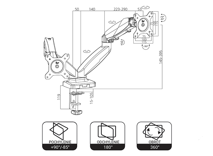 NOGRAVITY02 umożliwia montaż aż dwóch monitorów w standardzie VESA 75 oraz VESA 100 o masie od 2 do 7kg i rozmiarze od 15” do 27” każdy.