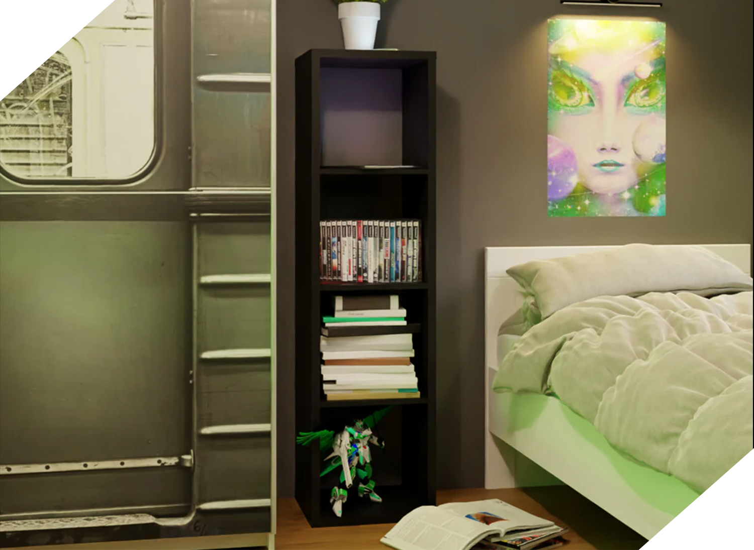 Wysoki czarny regał wąski - 3 półki posiada aż cztery przestronne wnęki, w której możesz ulokować swoje kociołki, eliksiry, mikstury i wszystko inne co jest Ci niezbędne pod ręką, ale brakuje Ci już miejsca na twoim stole magii.