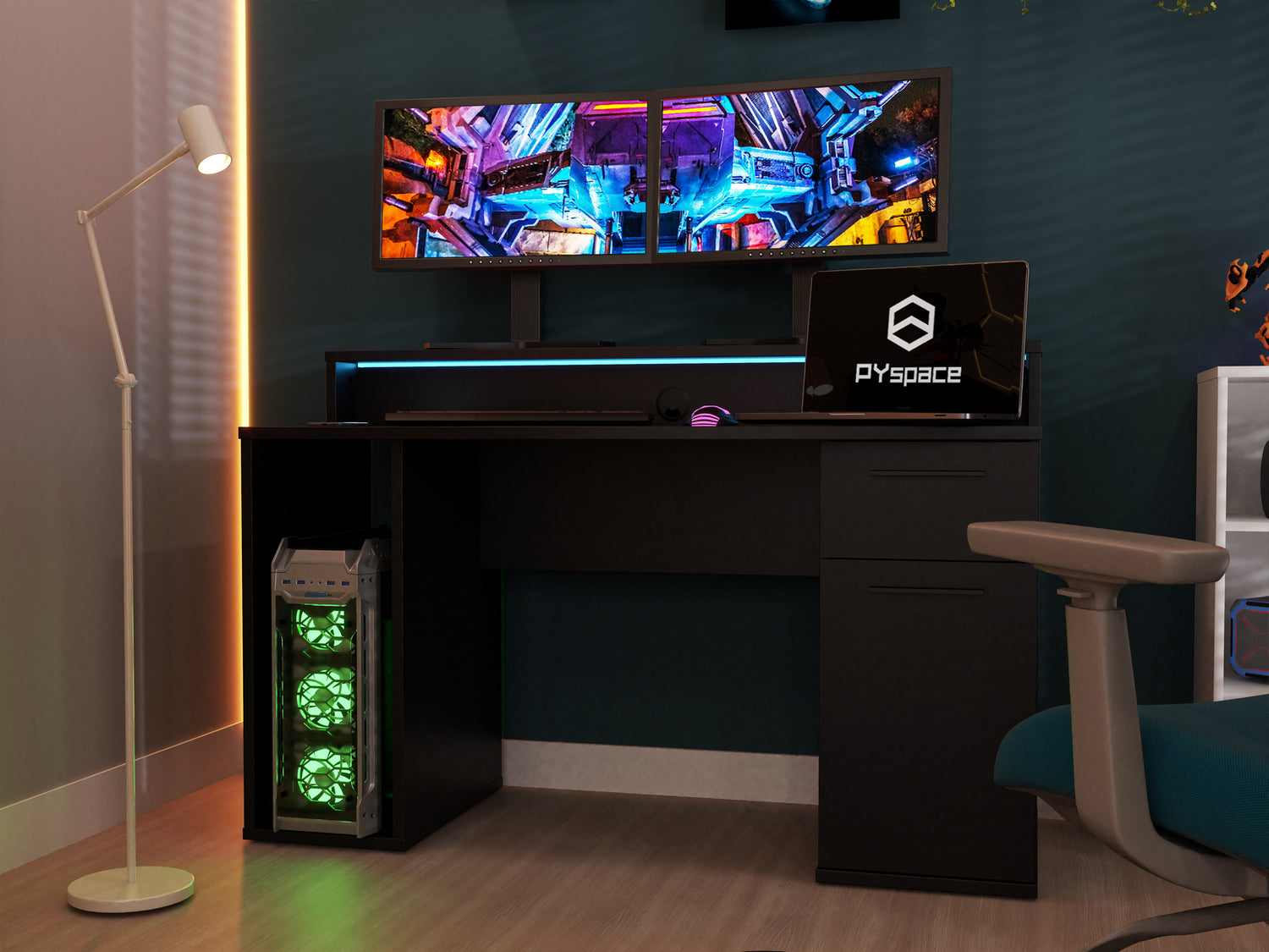 Pierwsze gry z kolegami z podwórka były przy biurku! Wtedy nikt nie zwracał uwagi na to, jakie to biurko jest. Miał na nim stać wielki monitor, który nie był płaski jak te teraz, klawiatura i myszka! Teraz jednak potrzebujemy trochę więcej miejsca na swoje rzeczy, chcemy grać wygodniej i zdrowiej. Dlatego w naszej wizualizacji małego pokoju gamingowego w jasnych kolorach w strefie z biurkiem wykorzystaliśmy czarne biurko gamingowe z szufladą i szafką - 140 cm, oraz szeroki biały regał z dwoma półkami. Już nie musisz się martwić dodatkowym miejscem. My o nie zadbaliśmy za Ciebie!